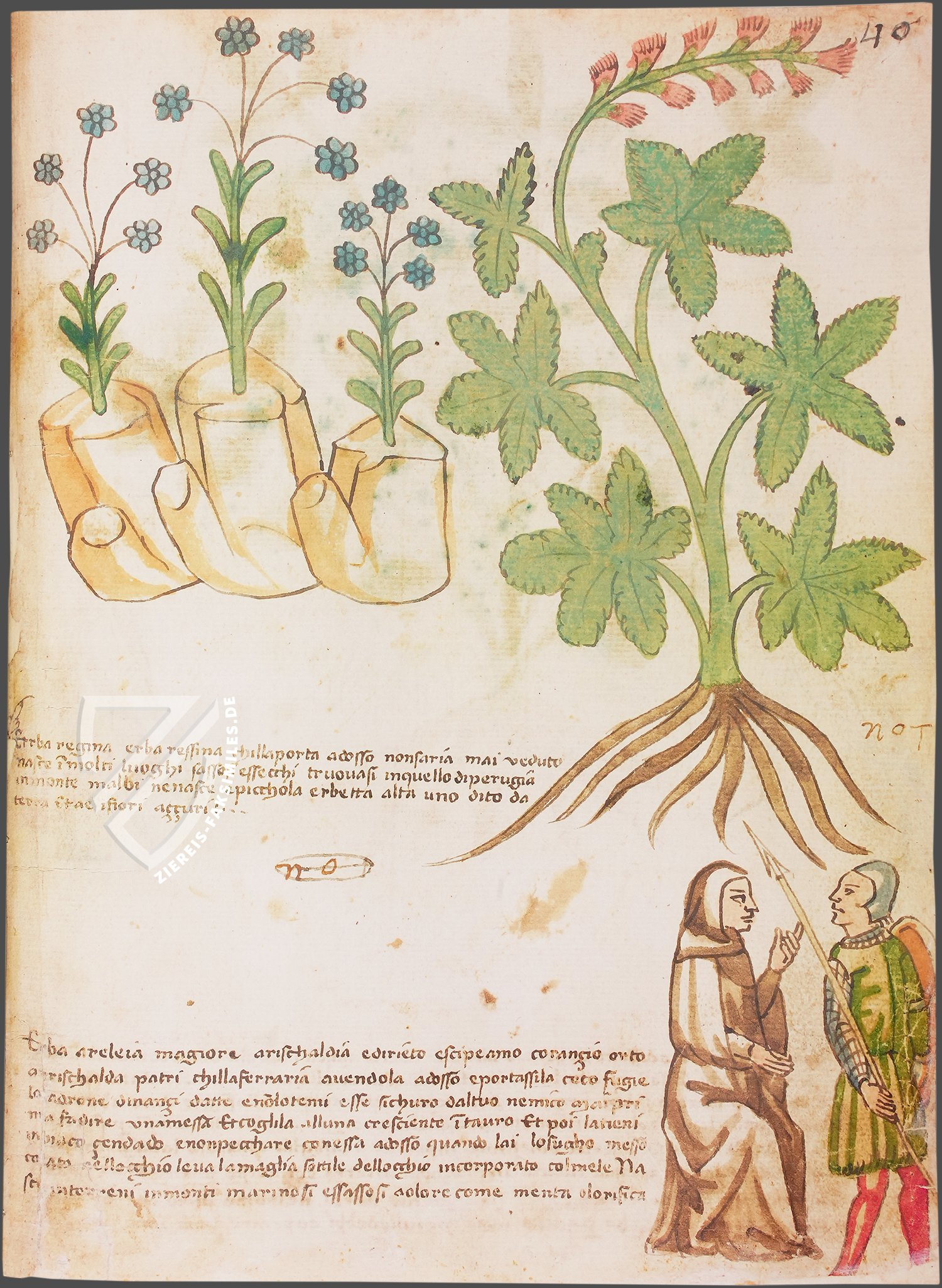 Die in sauberer gotischer Schrift verfassten italienischen Textpassagen enthalten Anleitungen für den Anbau und die Verwendung dieser Pflanzen. So werden der Standort, die Art des Bodens und die richtige Jahreszeit für die Anzucht und Ernte jeder Pflanze angegeben, ebenso wie Anweisungen, wie sie zubereitet und mit Wein, tierischen Fetten, Ölen, Honig oder Rosenwasser gemischt werden sollen. Außerdem wird jeder Pflanze eine Tugend zugeschrieben, und es werden auch astrologische Überlegungen angestellt, da die Sterne bestimmen, wann die Behandlungen am wirksamsten sind oder wann sie besser aufgeschoben werden sollten. Dies gilt insbesondere für den Aderlass, da man glaubte, der Mond habe eine ähnliche Wirkung auf den menschlichen Blutfluss wie die Gezeiten.