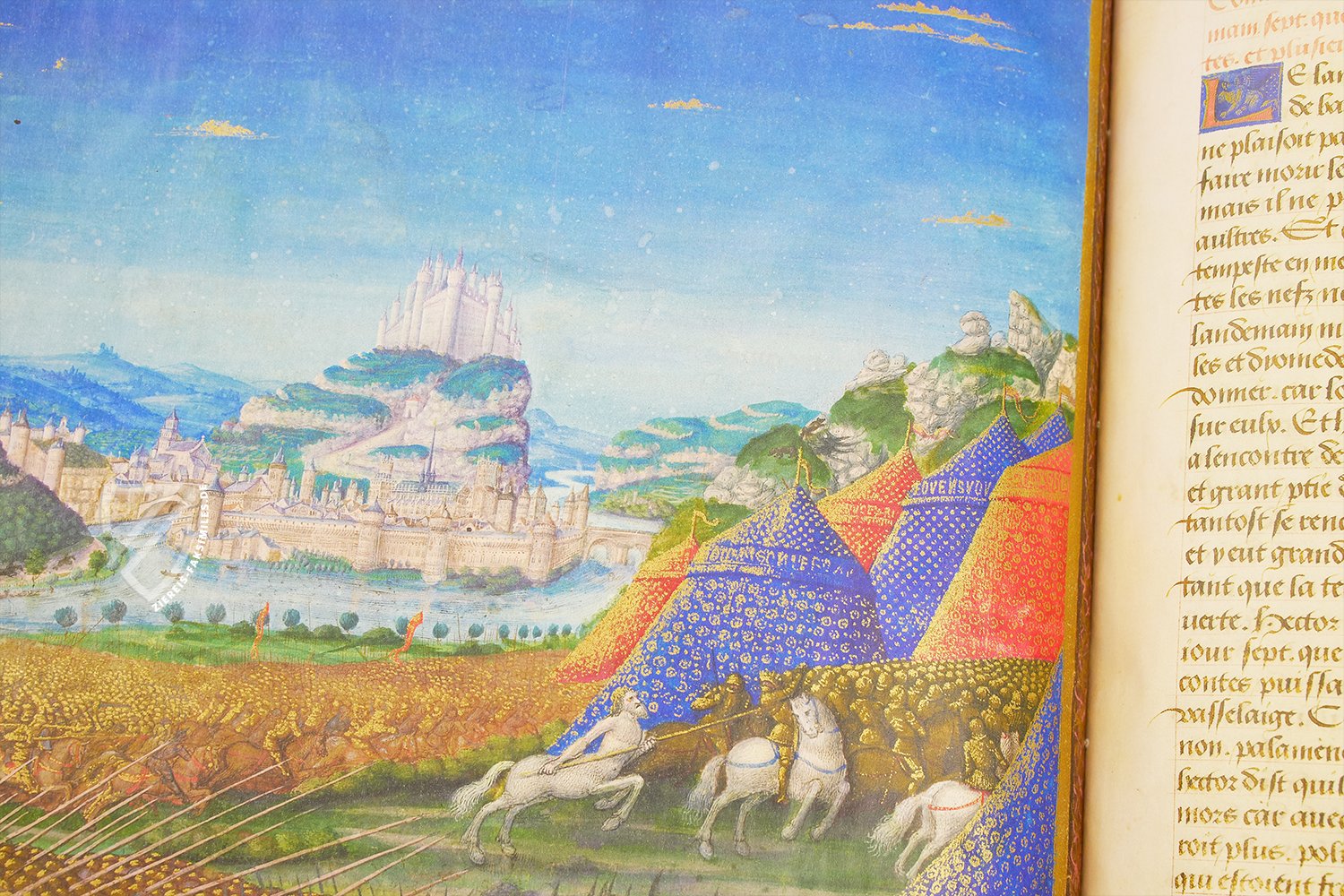 Die mythologische Erzählung vom Trojanischen Krieg ist ohne Zweifel eine der einflussreichsten und meist rezipierten Legenden aller Zeiten. Sie wurde immer wieder in verschiedensten Medien rezipiert, das aktuellste Beispiel hierfür ist Oliver Stones Hollywood-Blockbuster „Troja“ mit Brad Pitt und Orlando Bloom in den Hauptrollen. Auch in der Literatur wurde die zeitlose Sage unzählige Male bearbeitet. Der italienische Schrifsteller Guido delle Colonne widmete sich um das Jahr 1287 dem antiken Stoff. Er fertigte eine der bedeutendsten literarischen Ausgaben des Epos an, der über das gesamte Mittelalter hinweg zitiert und neu bearbeitet wurde. Um das Jahr 1500 wurde das Meisterwerk des Italieners im Künstleratelier des französischen Buchmales Jean Colombe mit sagenhaften Illustrationen ausgestattet. Es entstand eines der erstaunlichsten illuminierten Manuskripte in der Geschichte der mittelalterlichen Buchkunst. Das Manuskript ist ein unfassbar reich ausgestattetes Bilderbuch mit kunstvollen und historisch informativen Miniaturen auf so gut wie jeder Seite.