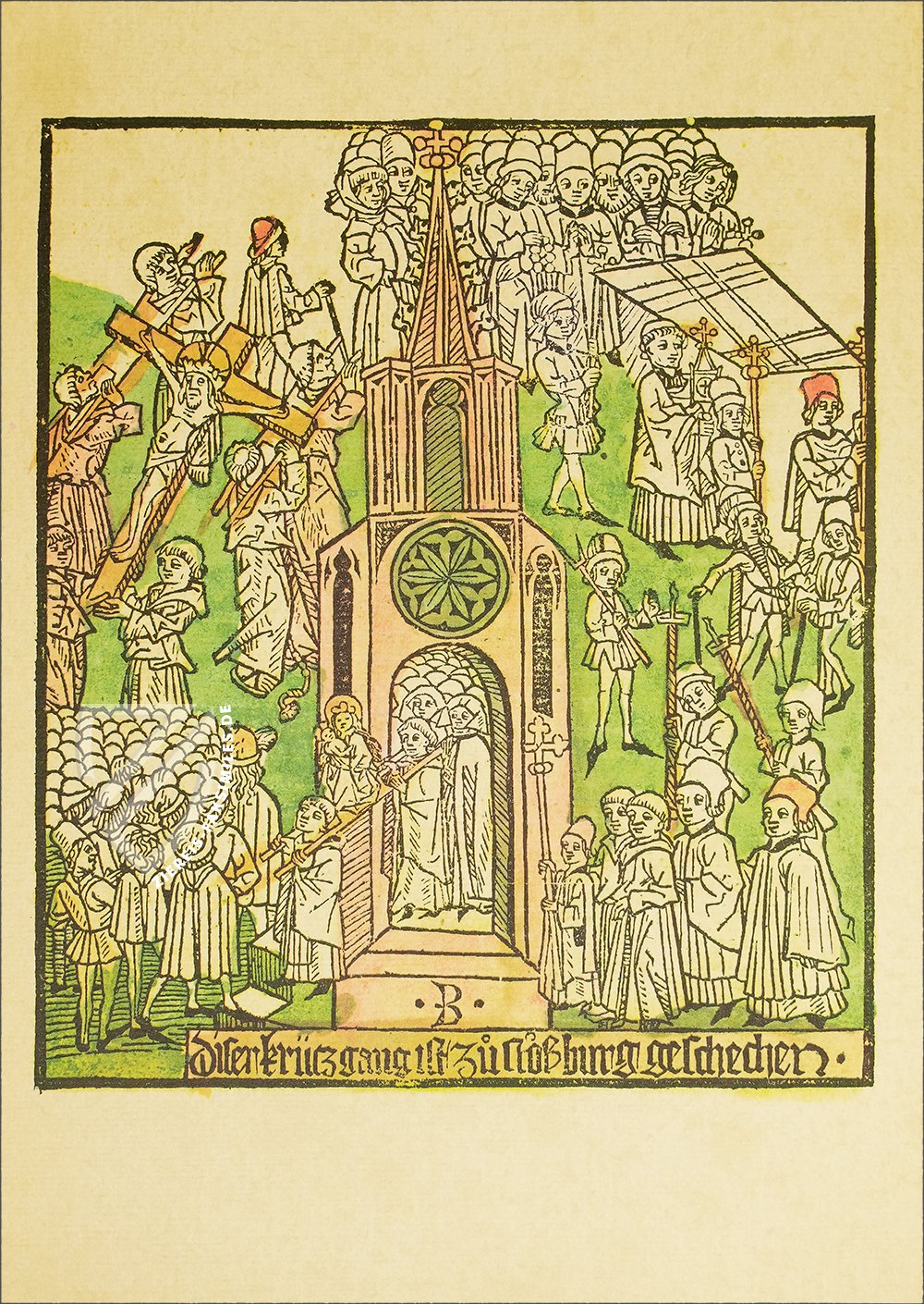 Peter von Hagenbach kniet mit verbundenen Augen und gefesselten Händen vor einer Menschenmenge und wartet auf den Hieb des Scharfrichters, der ihn dem Gottesurteil überantwortet. Er wurde 1474 für die Gräueltaten hingerichtet, die er und seine Truppen während der Besetzung von Breisach begangen hatten, darunter Mord, Vergewaltigung und Meineid. Sein gewalttätiges und tyrannisches Verhalten trug zum Ausbruch der Burgunderkriege bei.