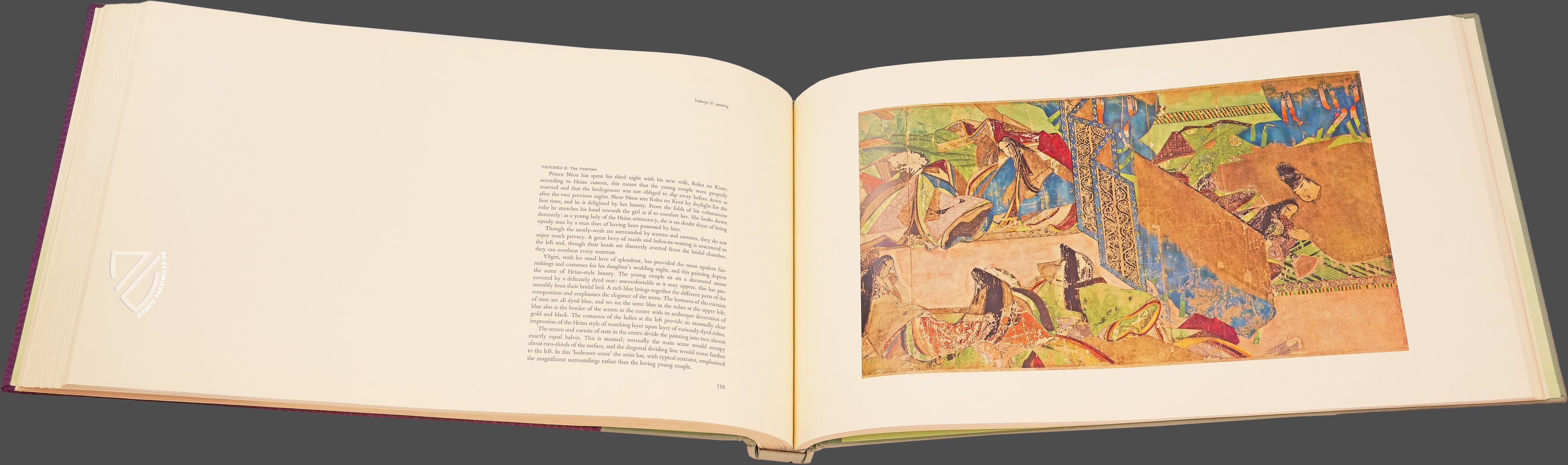 Warme Erdtöne bestimmen diese Szene voller trauriger Vorahnung. Sie gehört zu Kapitel 39, das mit dem poetischen und vielsagenden Ausdruck Yūgiri (夕霧) – Abendnebel – betitelt ist. Die hochgebildete Hofdame Murasaki ist die lebenslange Geliebte des Protagonisten Genji. Sie konnte sich zwar gerade von einer schweren Krankheit erholen, doch merkt nun, dass ihre Lebensenergie sich dem Ende neigt.