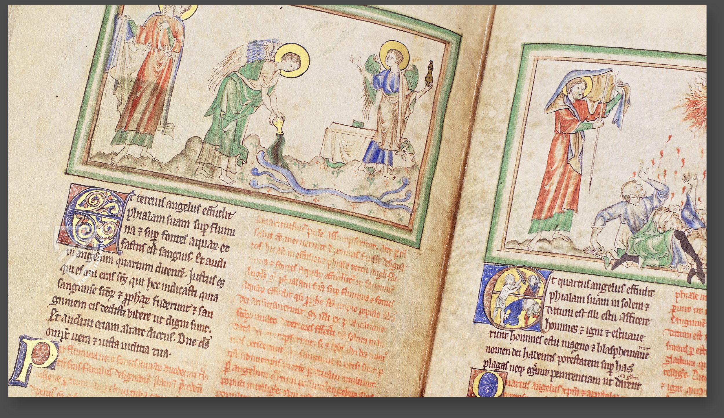 Der jeweils zugehöriger Text in schwarzer Tinte ist unter den Miniaturen zu lesen, begleitet von Berengaudus Kommentar zur Apokalypse. Dieser erklärende Text von einem Mönch namens Berengaudus aus der zweiten Hälfte des 11. Jahrhunderts wird hier in roter Tinte dem eigentlichen Text der Offenbarung beigefügt. Auf diese Weise fügt sich der biblische Text des Johannes, seine Erklärung und Deutung aus dem 11. Jahrhundert und die großartige englische Buchmalerei des 13. Jahrhunderts zu einem außergewöhnlichen künstlerischen Meisterwerk zusammen – der Getty-Apokalypse!