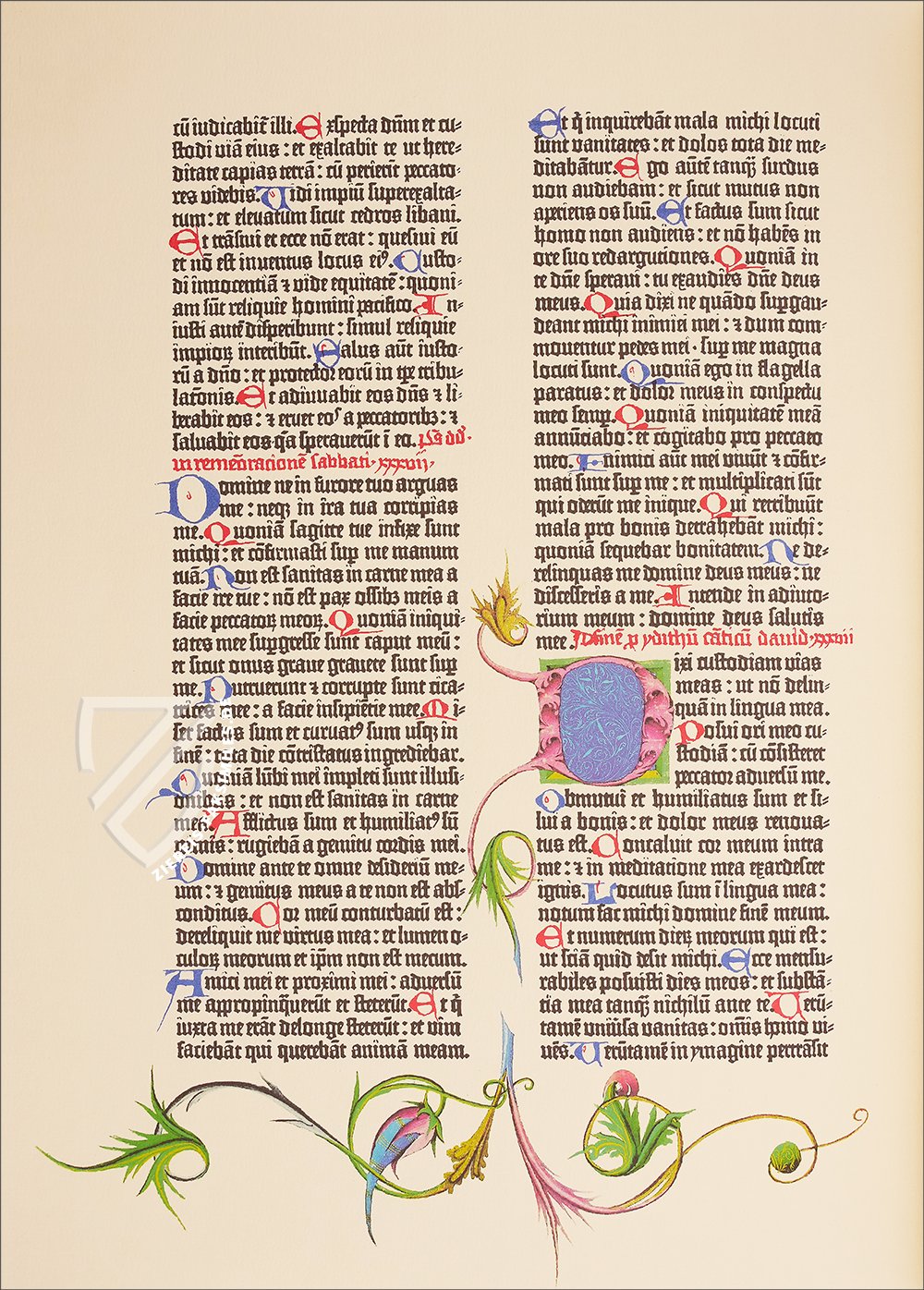 Indem der Drucker diesen Platz frei lieĂ, konnten die KĂ€uferinnen der Luxus-Erstausgabe ihre jeweiliges Exemplar von den Illuminatorinnen nach ihrem persönlichen Geschmack gestalten lassen. So wurde dieses wunderbare Exemplar mit kunstvollen Initialen und vegetabilen Ranken geschmĂŒckt. Die Initiale auf dieser Seite besteht aus rosafarbenen AkanthusblĂ€ttern, die ein blau gefĂŒlltes Binnenfeld umgeben, das ebenfalls ein filigranes Muster aufweist. Die geschwungenen RankenauslĂ€ufer entwickeln sich zu spitz zulaufende, grĂŒne BlĂ€tter sowie fantasievollen FrĂŒchten oder Knospen.