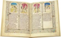 Die 176 Federzeichnungen sind in zarten Pastelltönen gehalten. Sie zeigen nicht nur biblische Szenen, sondern stellen auch alltägliche Szenen des mittelalterlichen Lebens in großer Detailtreue dar. Der Maler versetzt den Betrachter zurück in mittelalterliche Städte mit imposanten Stadttoren, Rittern und Handwerkern, die die Gassen bevölkern, Tempelbauten, Brunnen und Schmiedewerkstätten. Der Fantasie des Künstlers waren keine Grenzen gesetzt. Besonders gelungen sind die Darstellungen von menschlichen Figuren, die überraschend plastisch mit drapierten Gewändern und schraffierten Schatten wirken. Auf jeder Doppelseite finden sich vier aufregende Miniaturen, die durch Textpassagen näher beschrieben werden.
