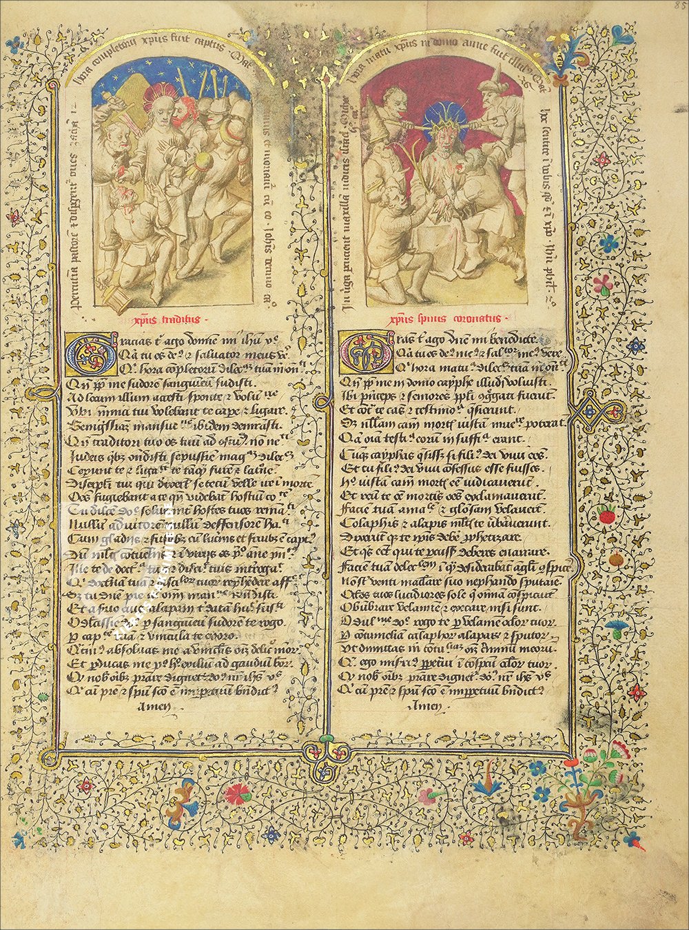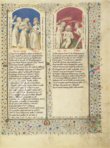 Dies ist ein schönes Beispiel für die Illumination des vorliegenden Manuskripts, das viele Rahmen mit filigranen goldenen Ranken und bunten Blumen enthält. Im Gegensatz zu ihnen wird die Farbpalette der Miniaturen auf Blau- und Grautöne reduziert, die die meisterliche Strichführung des Künstlers noch einmal mehr hervorheben. Die französisch-niederländischen Bauwerke aus der Gotik im Hintergrund weisen auf die Ursprünge des Manuskripts hin.