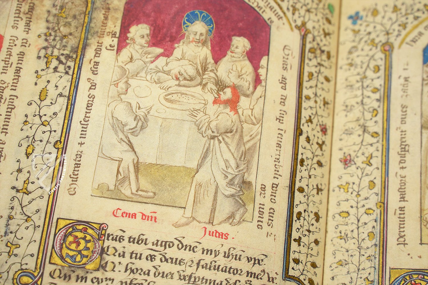 Judas unterscheidet sich von den anderen Aposteln nicht nur durch sein rotes Haar und seinen Bart, sondern auch durch seine namentliche Kennzeichnung in dieser Miniatur, die zeigt, wie er die Eucharistie von Jesus empfängt, der einen blau-goldenen Kreuzstab trägt. Die Füße des Judas ragen aus dem Rahmen heraus, was darauf hindeutet, dass er sich nach dem Empfang des Brotes sofort vom Abendmahl entfernen wird. Nach dem Johannesevangelium ist der Satan in dem Moment in Judas eingedrungen, als er das Brot aß, und hat ihn dazu gebracht, Jesus zu verraten.