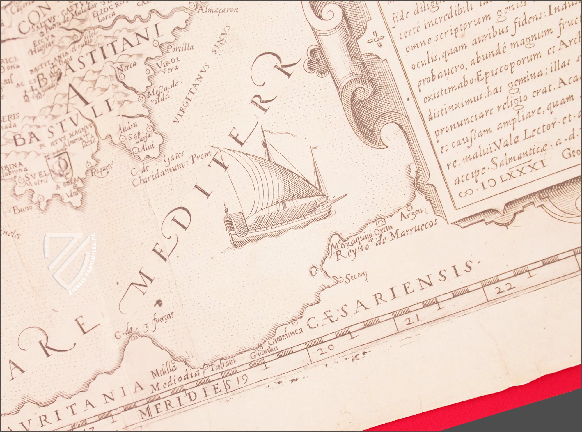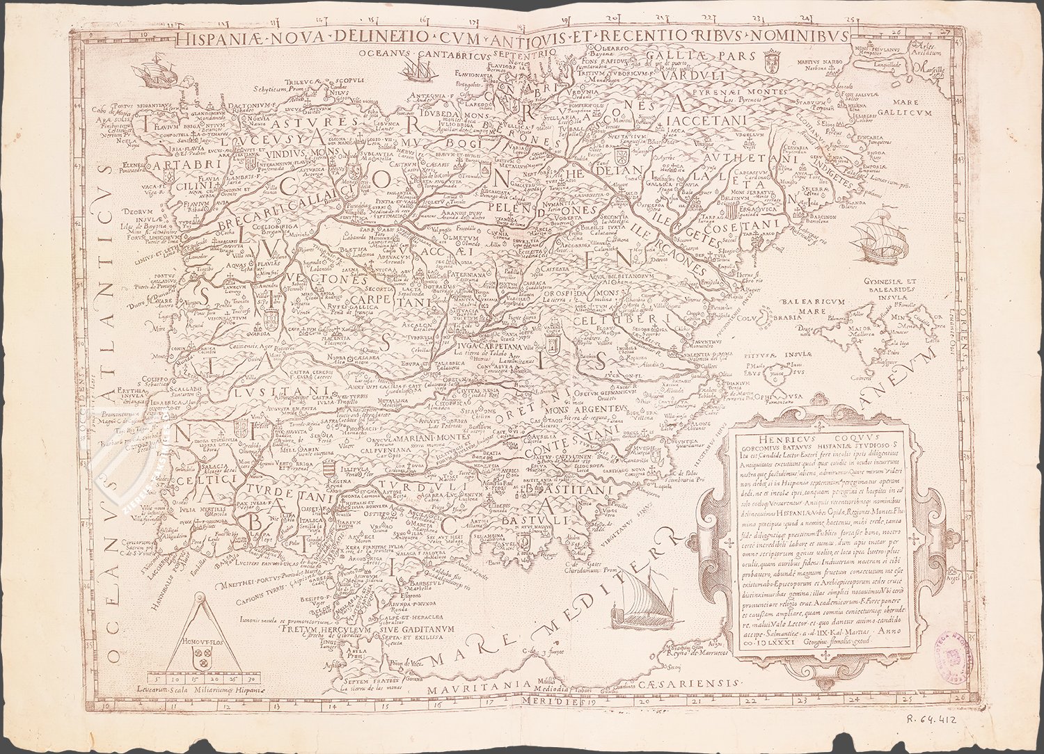 Der niederlĂ€ndische Humanist Enrique Cock schuf eine groĂartige Karte der Iberischen Halbinsel, wahrscheinlich die Ă€lteste, die in Spanien gedruckt wurde. Ihr vollstĂ€ndiger Titel lautet Hispaniae Nova Delineatio cum antiquis et recentioribus nominibus. Cock unternahm ab 1574 ausgiebige Reisen durch Spanien, die es ihm ermöglichten, die Karte in einer unglaublichen Detailgenauigkeit zu erstellen, insbesondere in Bezug auf FlĂŒsse, Berge und andere topographische Merkmale. In den Jahren 1581 und 1583 wurden jeweils zwei Ausgaben von Georgius Flemalia, einem Verleger aus Salamanca (aktiv 1580â1591), veröffentlicht, von denen allerdings nur zwei TeilstĂŒcke erhalten sind. Eines davon wurde in der Hessischen Landesbibliothek in Darmstadt entdeckt, wĂ€hrend das zweite in einen Atlas in der Spanischen Nationalbibliothek eingebunden war. Beide Teile gehören zu der Ausgabe aus dem Jahr 1583. Abgesehen von ihrer Schönheit und Seltenheit birgt die Karte eine FĂŒlle von Informationen. Moderne spanische und alte lateinische Ortsnamen erscheinen nebeneinander. Alte römische Verwaltungseinteilungen sind mit gepunkteten Linien voneinander abgegrenzt. Kleinere StĂ€dte sind durch Kreise markiert, gröĂere durch kleine HĂ€useransammlungen dargestellt; BistĂŒmer sind mit einem Kreuz gekennzeichnet, ErzbistĂŒmer mit einem Doppelarmkreuz. Die verschiedenen Königreiche, aus denen Spanien bestand, sind durch ihre entsprechenden Wappen reprĂ€sentiert, wĂ€hrend das persönliche Wappenzeichen des Autors in der linken unteren Ecke mit dem Motto Homo ut flos, einem Kompass und einer Waage abgebildet ist. In die rechte untere Ecke ist ein groĂes Plakat mit Architekturmotiven und einer ausfĂŒhrlichen Legende zur Karte und ihren Inhalten eingelassen, sowie Angaben zu ihrer Veröffentlichung. Die Karte identifiziert und benennt darĂŒber hinaus zum ersten Mal verschiedene Bevölkerungsgruppen, was in den 200 Jahren danach kein weiteres Mal mehr vorkommen sollte .