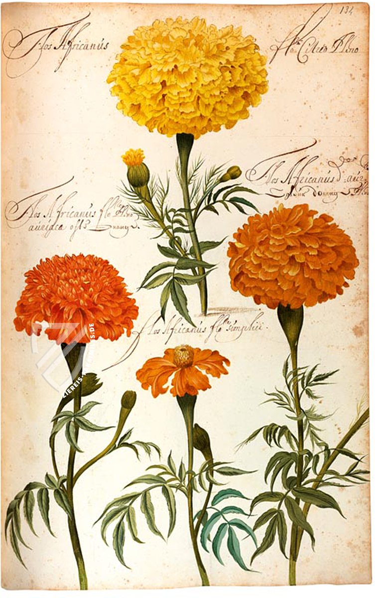 Biologisch als Tagetes erecta klassifiziert, stammt die Aufrechte Studentenblume aus Mexiko, wird aber oft fĂ€lschlicherweise Afrika zugewiesen; so auch in diesem ansonsten makellosen Barockaquarell von Franciscus de Geest, das sowohl die gelbe als auch die orangene Sorte abbildet. Unten ist die BlĂŒte dargestellt, wobei die meisten BlĂŒtenblĂ€tter entfernt wurden, so dass das Staubblatt sichtbar wird.