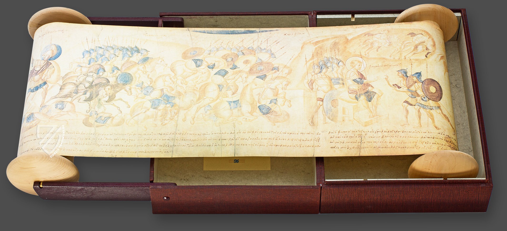 Die in der Antike übliche Schriftrolle wurde zwischen dem 2. und 4. nachchristlichen Jahrhundert vom gebundenen Codex abgelöst. Erst der Codex ermöglichte es, Farben dick aufzutragen und den Text mit gerahmten Bildern zu unterbrechen. In der Schriftrolle dagegen gingen die Bilder noch fließend ineinander über, was am illustrierten Zyklus des vorliegenden Exemplars eingehend studiert werden kann. Nicht nur die trotz der kriegerischen Inhalte anrührenden Bilder, sondern auch der Umstand, dass sie der byzantinischen Hofschule erst des 10. Jahrhunderts entstammt, machen diese Rolle zu einem weltweit einzigartigen Juwel. Möglicherweise haben zeitgenössische militärische Erfolge der Byzantiner im Heiligen Land zur Auswahl des häufig kriegerischen Josua-Buches geführt. Entstanden ist dadurch jedenfalls ein einzigartiger Kunstschatz aus Byzanz!