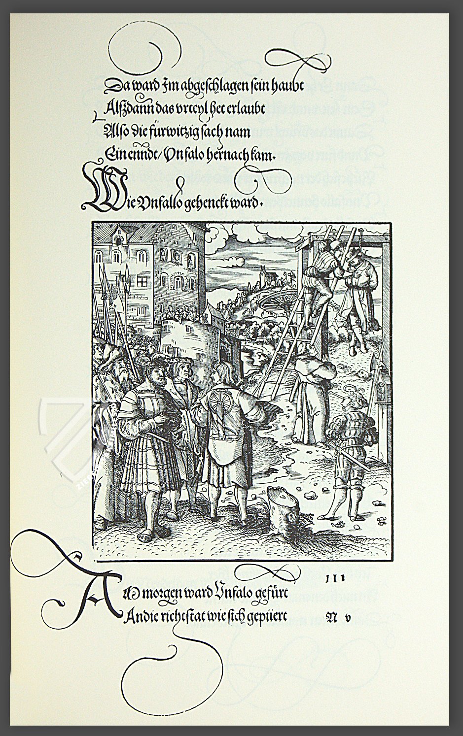 Trotz seines grausigen Themas – eine Hinrichtung durch Erhängen – zeigt dieser hervorragende Holzschnitt die außergewöhnlichen Fähigkeiten des Künstlers, Gebäude, Landschaften und menschliche Figuren realistisch und kunstvoll darzustellen. In der Geschichte fürchten drei Anführer die Auflösung ihrer Armeen, wenn Theuerdank (Maximilian) seine Verlobte heiraten würde und dann versucht sein könnte, sein ritterliches Abenteuer zu beenden. Aber ihre Pläne werden vereitelt und alle drei werden hingerichtet. Unfalo, dessen Name eine Variante von "Unfall" darstellt, findet sein Ende am Galgen.