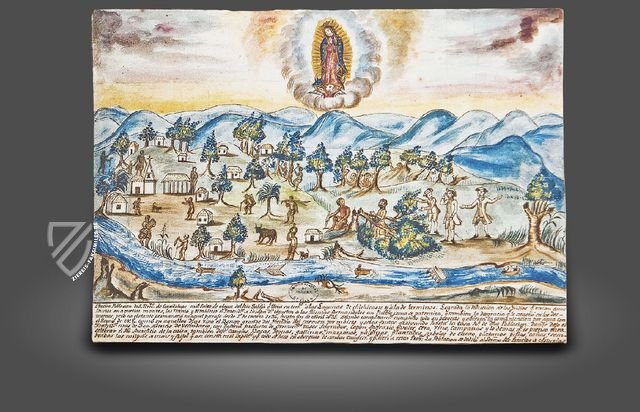 Der Ort der Entstehung dieses schönen Bildes einer Siedlung liegt im heutigen mexikanischen Bundesstaat Chiapas, die Zeit ist das Jahr 1795. Es handelt sich um eine Federzeichnung, die liebevoll mit Aquarellen verziert wurde, um diese idealisierte, lĂ€ndliche Darstellung einer Siedlung zu schaffen, die damals als San Fernando de Guadalupe bekannt war. Passenderweise schwebt und herrscht die Jungfrau von Guadalupe ĂŒber der Szene, Mexikos wichtigstes religiöses Symbol.