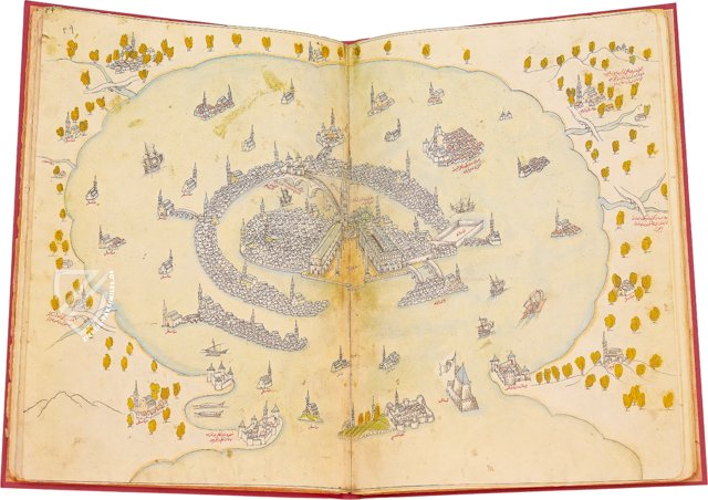 Das Osmanische Reich war im 16. Jahrhundert auf seinem Höhepunkt und Sultan Suleiman I. (1494-1566) herrschte von Konstantinopel aus über ein Gebiet, das sich vom Balkan und den Küsten Nordafrikas im Westen bis nach Persien im Osten erstreckte. Dieser militärische Erfolg brachte auch ein riesiges Netz von Bibliotheken, Schulen und Gelehrten unter osmanische Kontrolle, darunter fast die gesamte islamische Gelehrtentradition. Muslimische Gelehrte zeichneten sich auf vielen Gebieten aus, aber auf keinem so sehr wie auf der Astronomie, die auch ein wichtiges Werkzeug für Kartographen wie Piri Reis (ca. 1465-1553) war. Mit diesem Wissen ausgestattet, schuf er einige der wichtigsten kartografischen Werke dieser Zeit, von denen viele heute noch erhalten sind, darunter mehrere Weltkarten und das Kitab-i bahriye oder Buch der Seemannschaft. Der Khalili-Portolan-Atlas aus dem 17. Jahrhundert basiert weitgehend auf diesem Werk, wurde jedoch mit neueren italienischen und niederländischen geografischen Kenntnissen aktualisiert, umfasst im Gegensatz zum Original auch das Schwarze Meer und enthält außerdem eine Reihe von Stadtansichten, darunter Istanbul, Venedig und Kairo, die den Überschwang der osmanischen topografischen Malerei offenbaren.