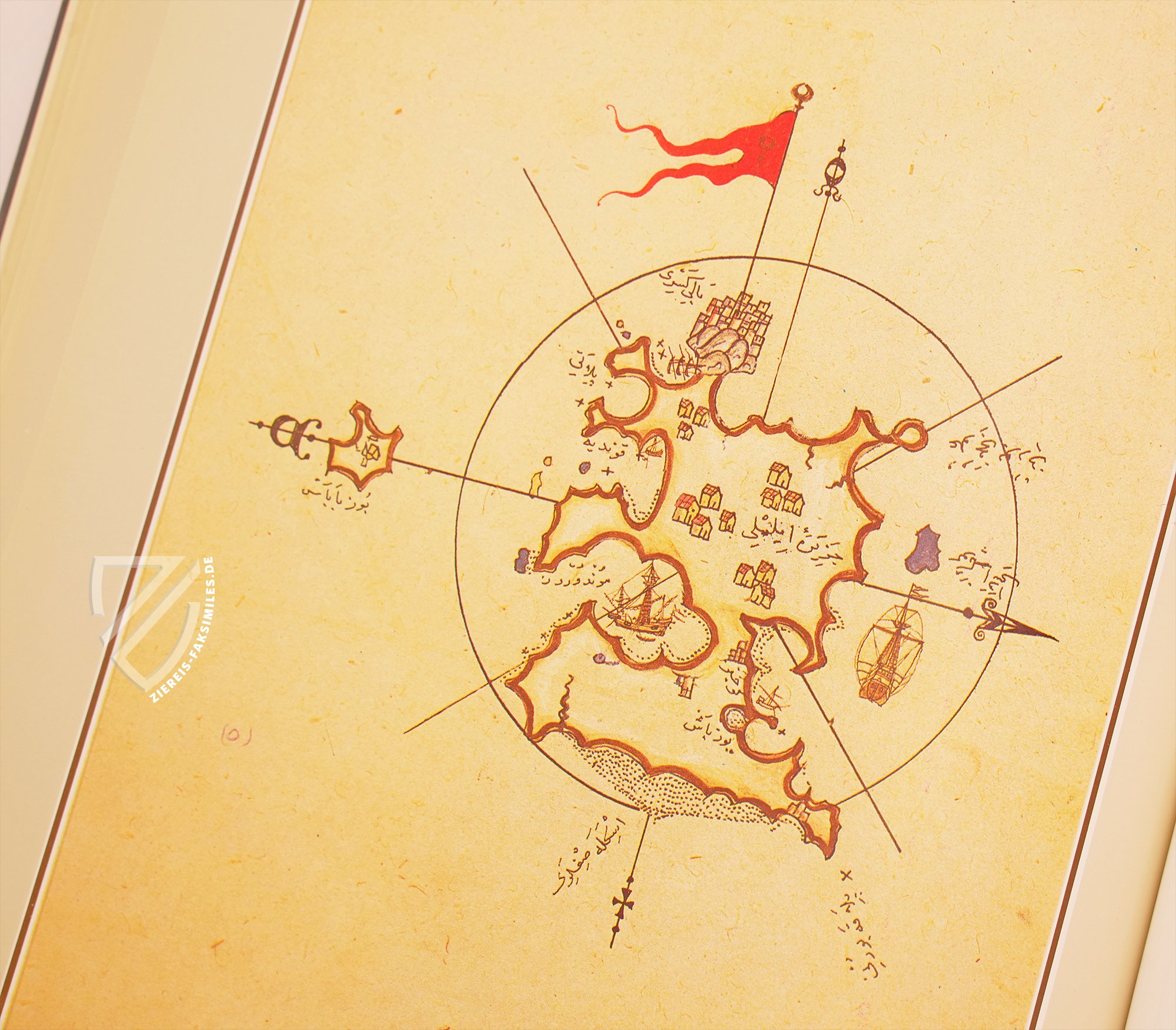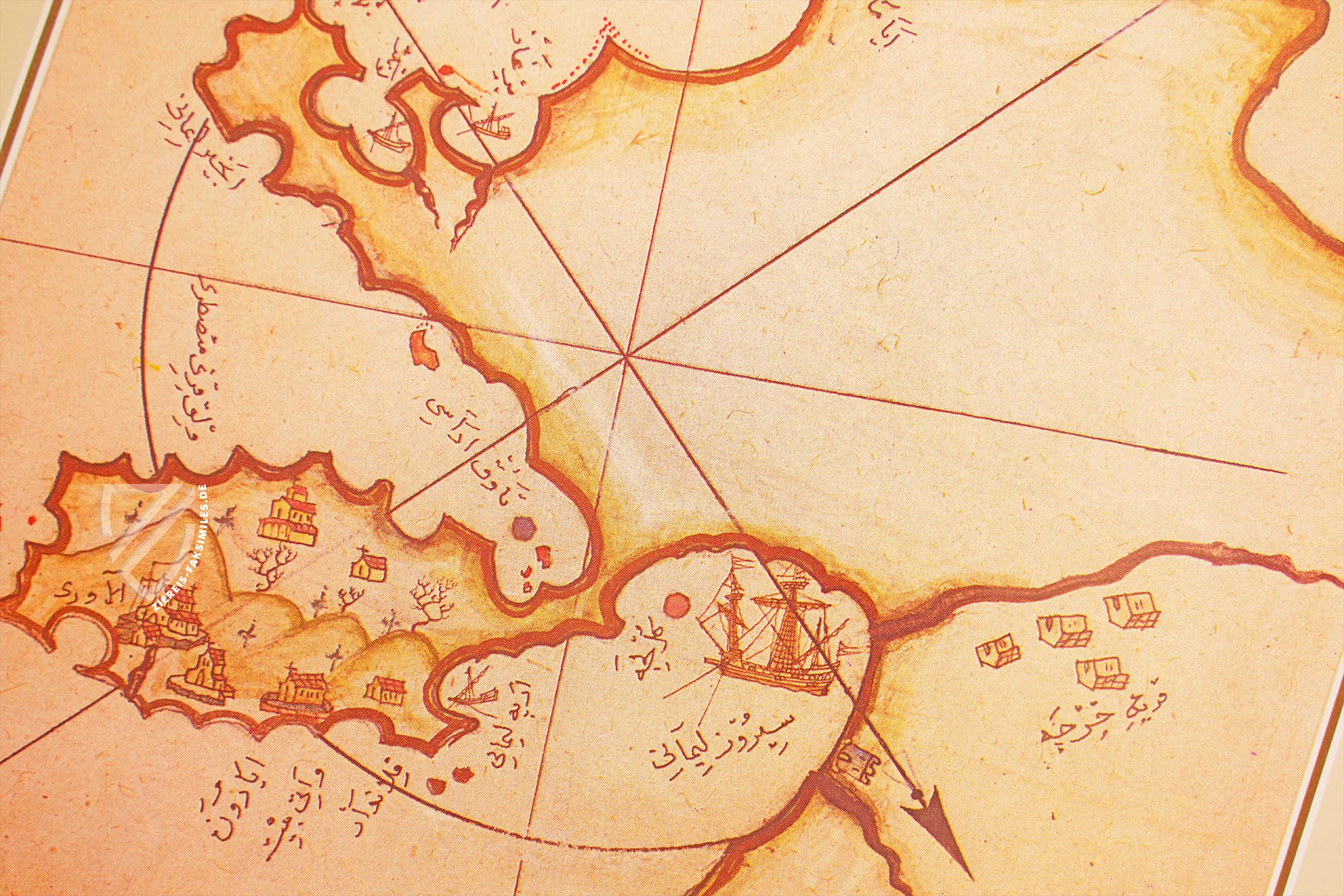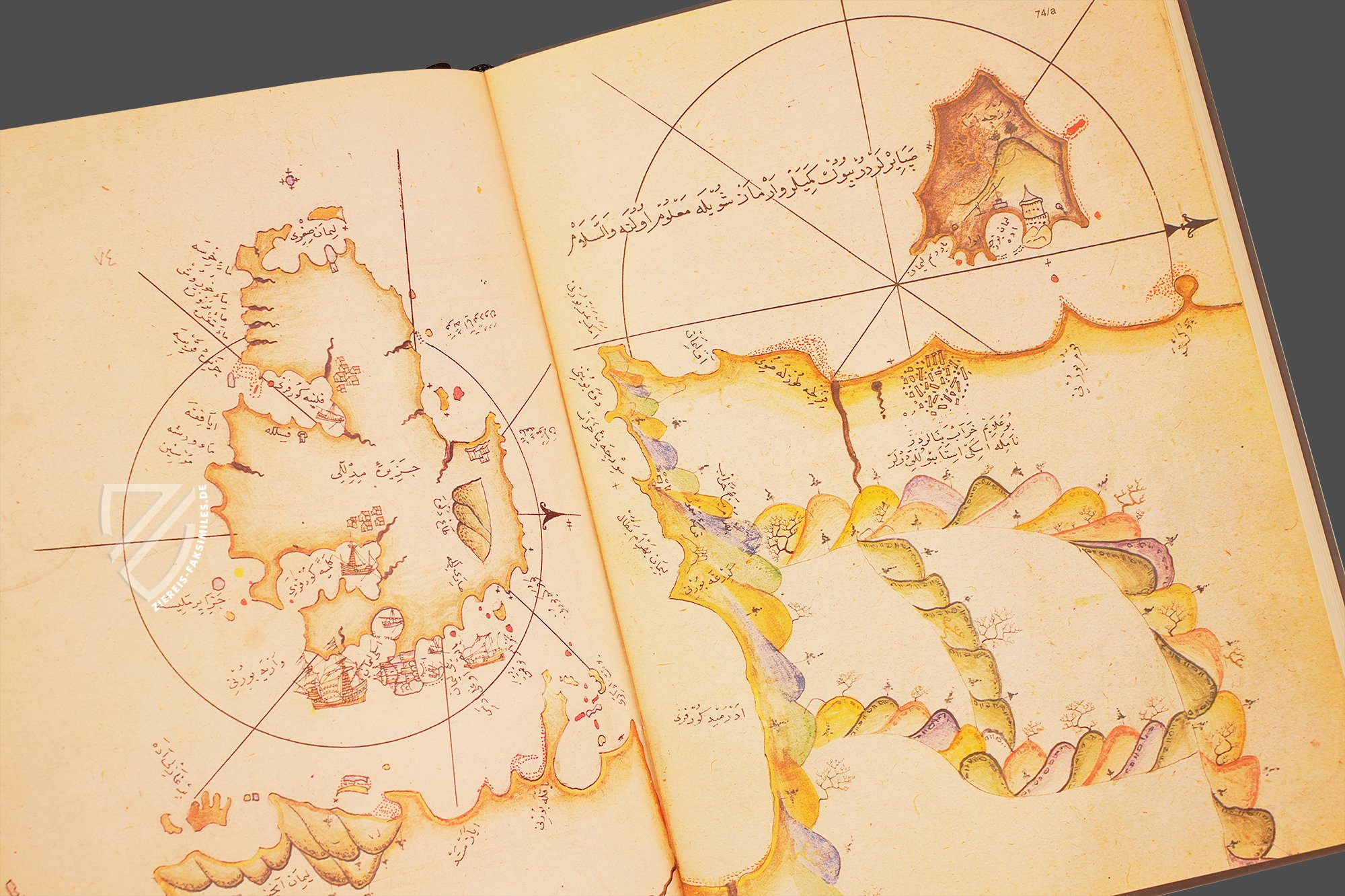 Das Kitâb-ı Bahriye: Piri Reis' Buch der Seefahrt ist wohl eines der schönsten Zeugnisse osmanischer Kartografie. Die schmuckvolle Abschrift des geschätzten Handbuchs über die Seefahrt im Mittelmeer, die heute im Topkapı Sarayı in Istanbul verwahrt wird, entstand in der zweiten Hälfte des 16. Jahrhunderts und enthält 215 vielfarbige Karten des gesamten Mittelmeerraums. Während die detailliert dargestellten Küstenlinien in Gold erstrahlen, heben sich die Flüsse davon in Schwarz ab. Zahllose kleine Illuminationen von Siedlungen und Schiffen beleben die oft minimalistisch anmutenden Karten. Ursprünglich widmete der Admiral der osmanischen Flotte und Kartograf Piri Reis (um 1470–1554) sein kartografisches Meisterwerk, das er 1521 fertigstellte, Sultan Süleyman I. (ca. 1494/96–1566). Der Großwesir Ibrahim Pascha (um 1493–1536) beauftragte ihn kurze Zeit später mit der Erweiterung und Überarbeitung des Handbuchs, auf der die vorliegende Handschrift beruht.
