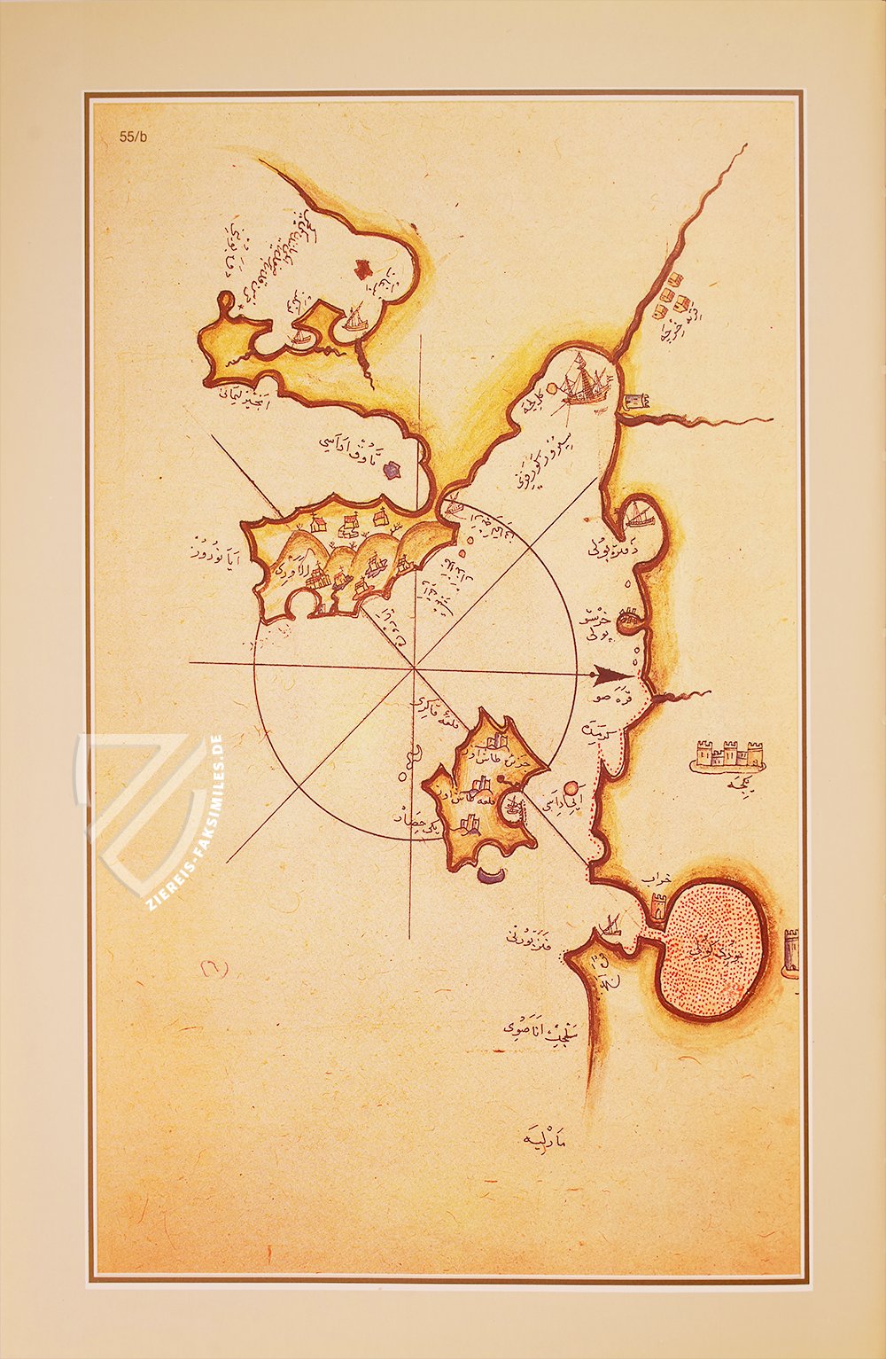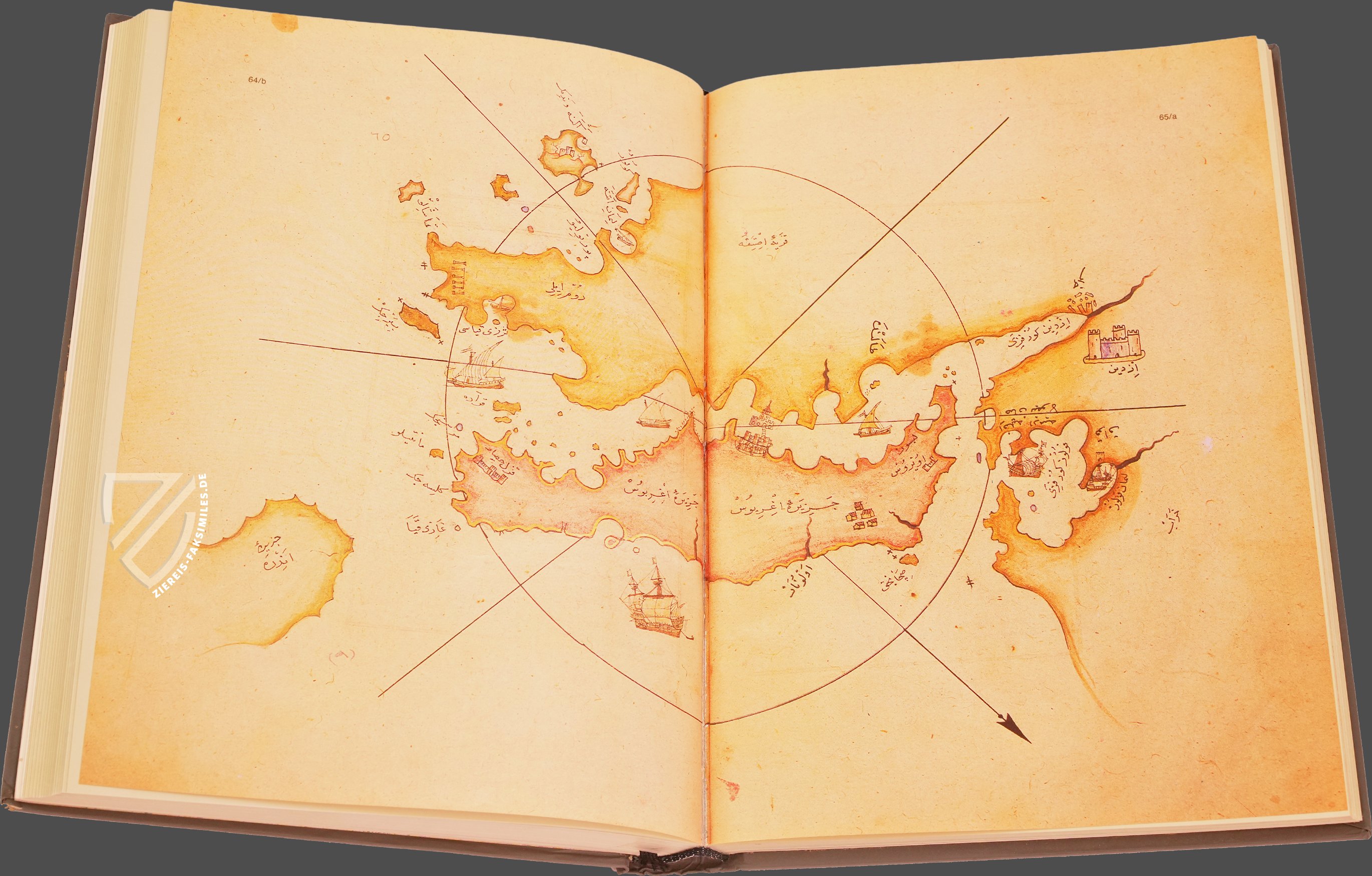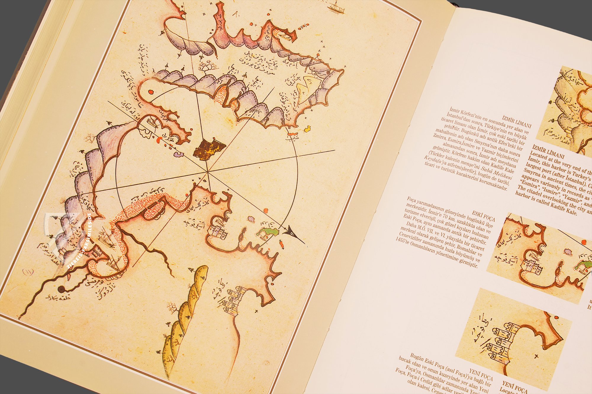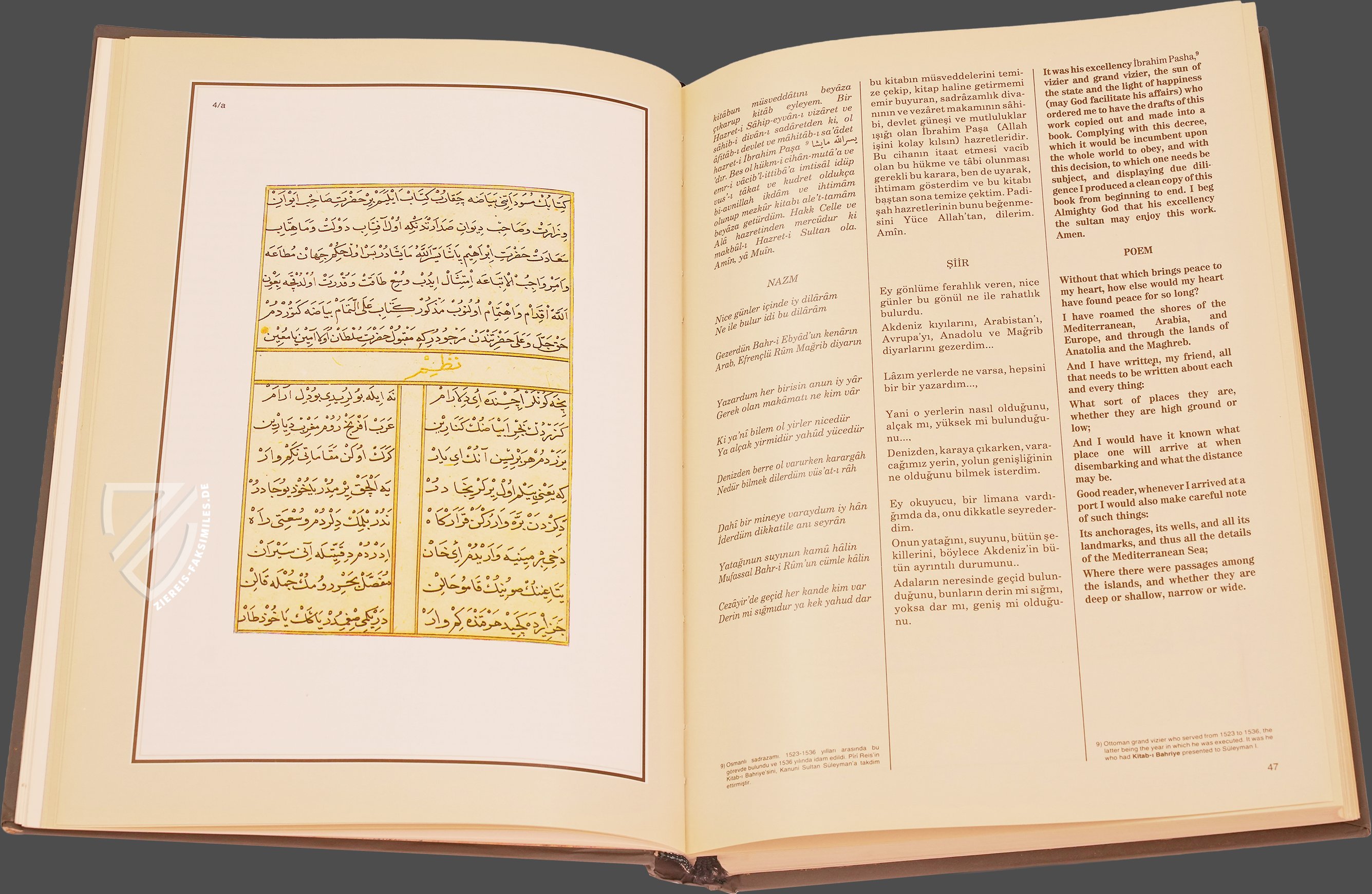Das Kitâb-ı Bahriye: Piri Reis' Buch der Seefahrt ist wohl eines der schönsten Zeugnisse osmanischer Kartografie. Die schmuckvolle Abschrift des geschätzten Handbuchs über die Seefahrt im Mittelmeer, die heute im Topkapı Sarayı in Istanbul verwahrt wird, entstand in der zweiten Hälfte des 16. Jahrhunderts und enthält 215 vielfarbige Karten des gesamten Mittelmeerraums. Während die detailliert dargestellten Küstenlinien in Gold erstrahlen, heben sich die Flüsse davon in Schwarz ab. Zahllose kleine Illuminationen von Siedlungen und Schiffen beleben die oft minimalistisch anmutenden Karten. Ursprünglich widmete der Admiral der osmanischen Flotte und Kartograf Piri Reis (um 1470–1554) sein kartografisches Meisterwerk, das er 1521 fertigstellte, Sultan Süleyman I. (ca. 1494/96–1566). Der Großwesir Ibrahim Pascha (um 1493–1536) beauftragte ihn kurze Zeit später mit der Erweiterung und Überarbeitung des Handbuchs, auf der die vorliegende Handschrift beruht.