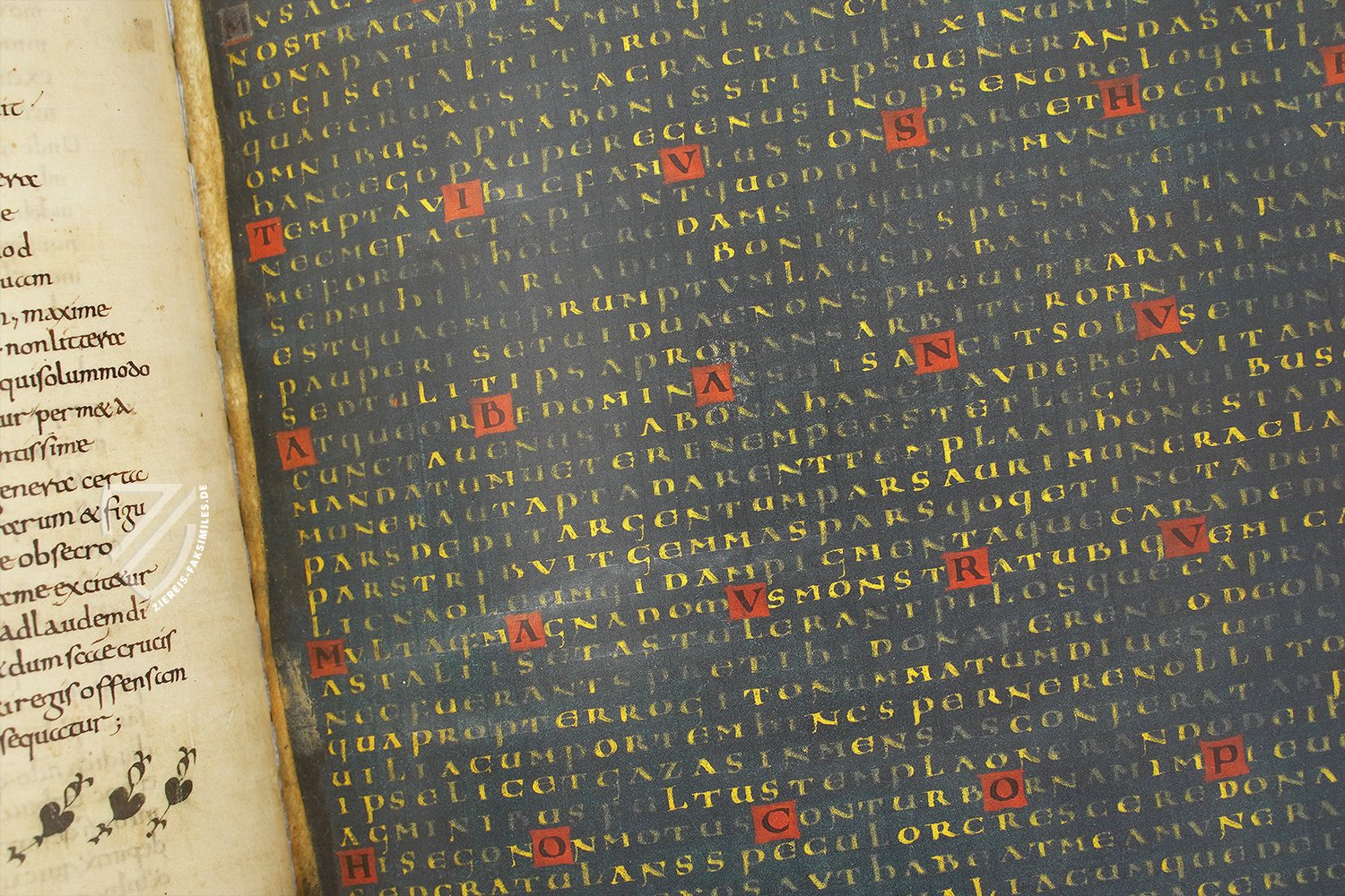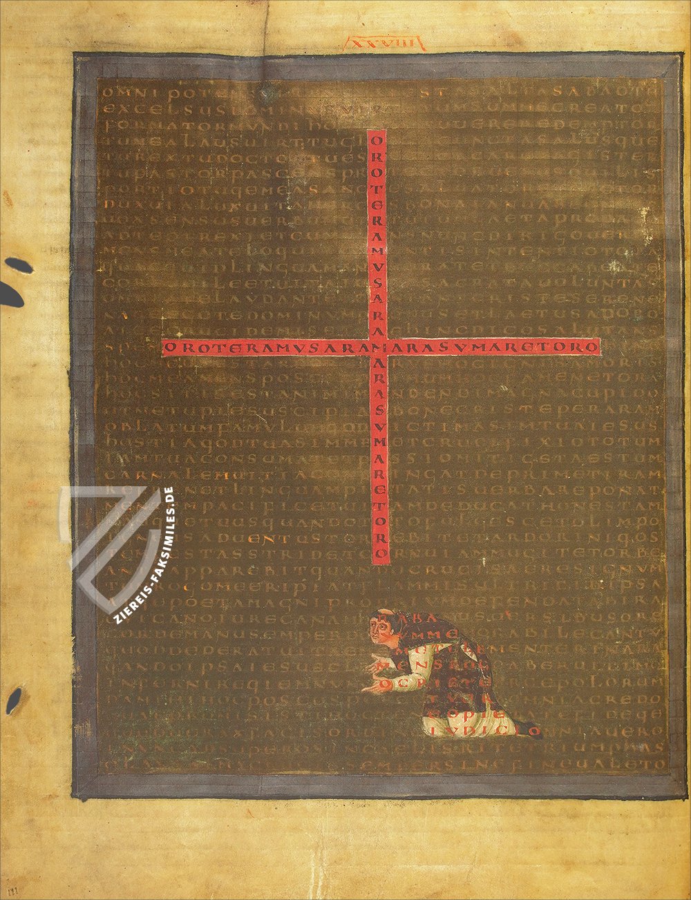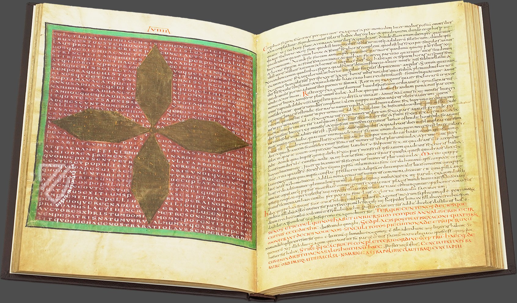Schon zu seiner Lebzeit als praeceptor Germaniae gefeiert, war Hrabanus Maurus (ca. 780-856) ein fränkischer Mönch, Bischof von Mainz und ein produktiver Autor der karolingischen Renaissance. Eines seiner populärsten Werke ist der Liber de laudibus sanctae crucis, eine Reihe von anspruchsvollen carmina figurata - Figurengedichten - im Stil des großen Alkuin, seines Lehrmeisters. Ursprünglich um 810–814 entstanden, sind die 28 komplexen Figurengedichte eine Art biblisches Worträtsel, das sich aus einzelnen Buchstaben und Buchstabengruppen zusammensetzt. Sie bilden in sich geschlossene Gedichte oder Wortfolgen, die mehrere Ebenen eröffnen und sich immer auf den Grundgedanken der Komposition, die Verherrlichung des Kreuzes, beziehen. Die Vatikanische Bibliothek bewahrt wohl das schönste erhaltene Exemplar dieses Meisterwerks religiöser Dichtkunst, das um 825 im Kloster Fulda entstand und dem Mainzer Erzbischof Otgar gewidmet ist.