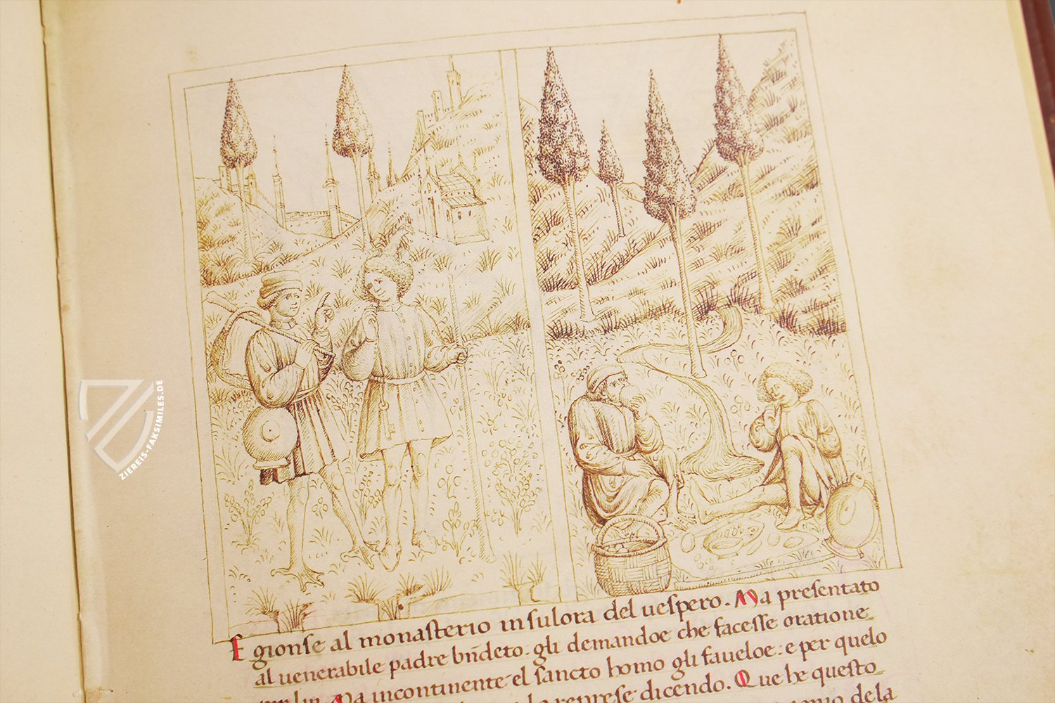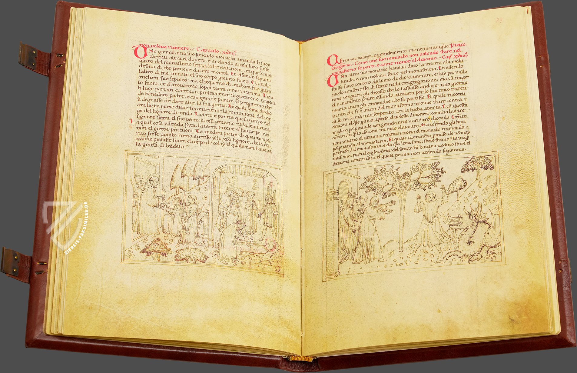 Der kurz nach dem Zusammenbruch des Weströmischen Reiches im italienischen Nursia (dem heutigen Norcia) geborene heilige Benedikt ist bekannt für die Abfassung seiner Benedikts-Regel im Jahr 516 und die Gründung der Abtei Montecassino im Jahr 529. Er gilt als Vater des abendländischen Mönchtums und als eine der bedeutendsten Persönlichkeiten der frühen Kirche, die einen nachhaltigen Einfluss ausübte. Seine Lebensgeschichte wird in dieser Handschrift erzählt, die mit 87 Federzeichnungen von höchster Qualität illustriert und in den 1460er Jahren in Italien entstanden ist. Neben dem Leben des Heiligen ist die Handschrift ein eindrucksvolles Zeugnis des klösterlichen Lebens im 15. Jahrhundert. Die Miniaturen geben nicht nur Einblicke in das Innere der Kirche, sondern auch in Gemeinschaftsräume, Wohnräume, Kapitelsäle, Gärten, Refektorien und Küchen. Neben den Mönchen in wallenden Gewändern sind auch Laien aus verschiedenen Schichten in der Mode des zeitgenössischen Italiens dargestellt und viele Stadtansichten dienen als kunstvolle Hintergründe.