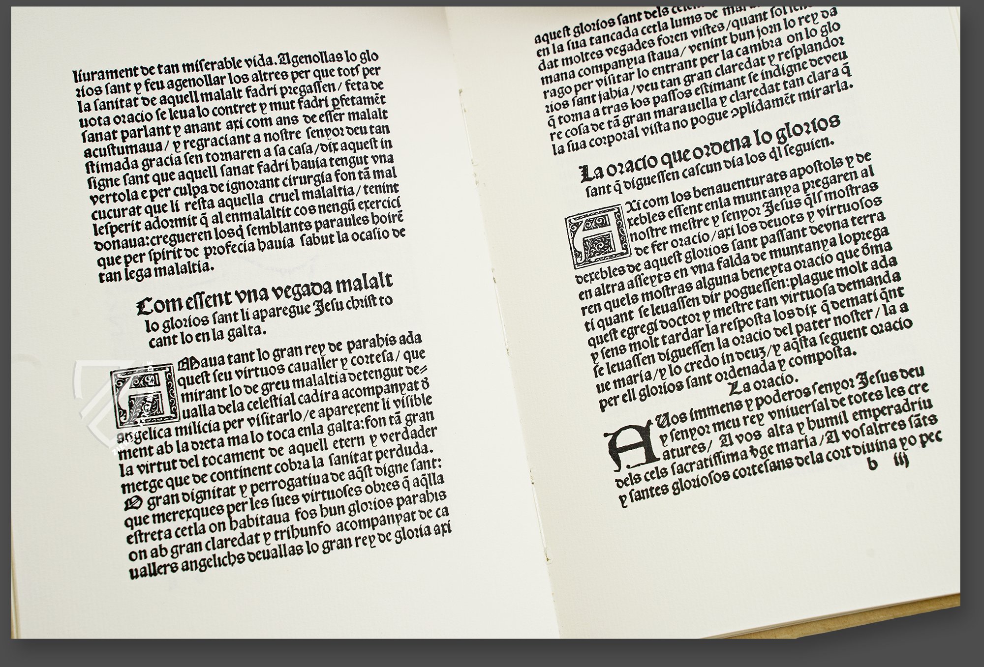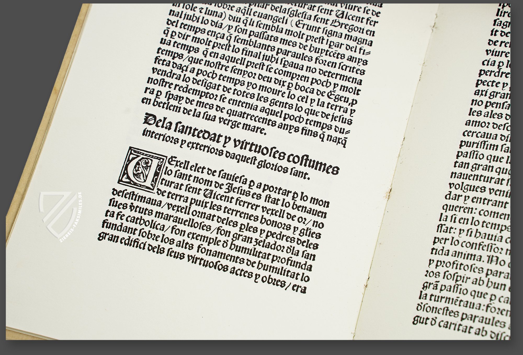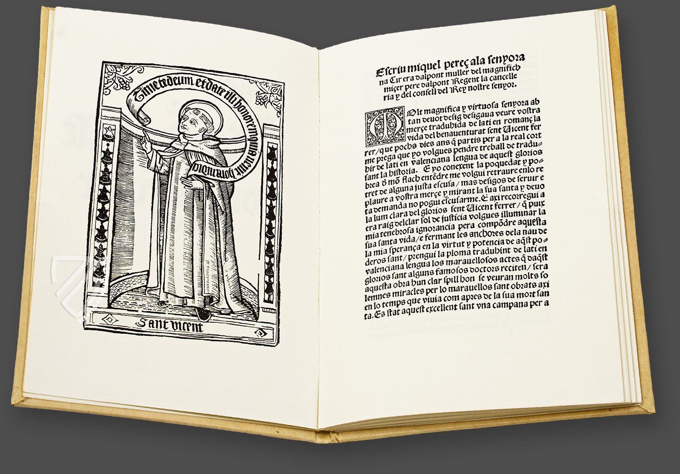 Das Leben des Heiligen Vincent Ferrer ist ein gedruckter Codex, der im Jahr 1510 in der Werkstatt des berühmten Druckers Joan Joffre angefertigt wurde. Es handelt sich dabei um die weltweit erste Biographie des einflussreichen Predigers Ferrer, welcher mit seinen Taten und Visionen einen entscheidenden Beitrag zur Beendigung des abendländischen Schismas in der katholischen Kirche beitrug. Neben einer fantastischen Druckgraphik, die das Portrait des Heiligen zeigt, ist die kostbare Schrift zusätzlich durch gravierte Initialen veredelt.