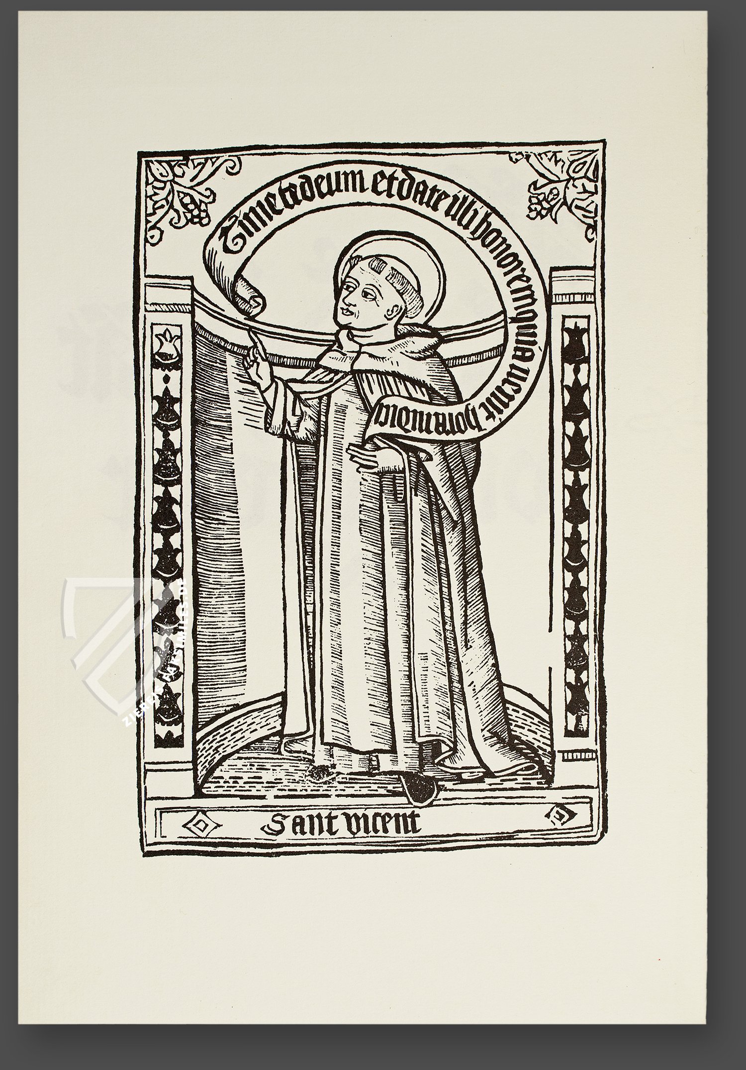 Dieses prächtige Holzschnittporträt des heiligen Vincent Ferrer dient als Frontispiz des Codex. Obwohl es sich bereits um ein gedrucktes Buch handelt, setzt es die Tradition der Widmungsminiaturen aus der Spätantike fort. Das sind normalerweise Portraits des Auftraggebers der Handschrift, und zwar oft in einer Szene, in der sie ihnen überreicht wird, oder das Portrait einer verstorbenen Person, der sie gewidmet ist, wie einem Heiligen oder dem Gründer eines Klosters.