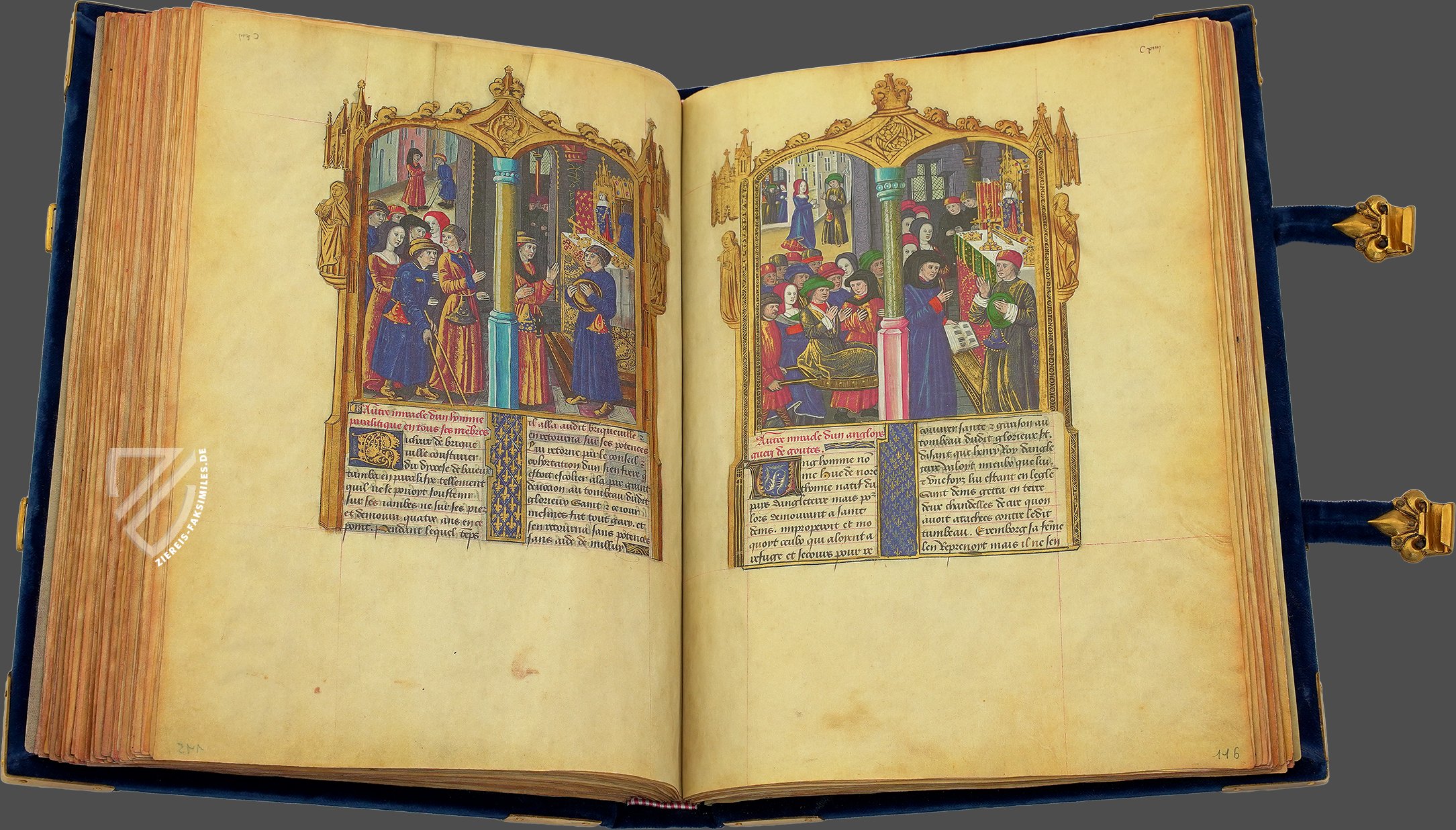 - 122 Miniaturen (davon 48 ganzseitig) aus dem Leben König Ludwigs des Heiligen, reiche Rahmenverzierungen und unzählige Zierinitialen