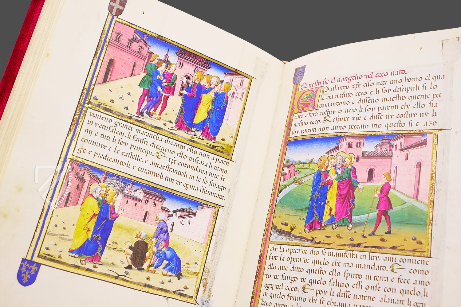 Mit insgesamt stolzen 324 Miniaturen beeindruckt das Legendarium seinen Betrachter. Jede einzelne Darstellung strahlt in metallischem Glanz in Kombination mit einer erstaunlichen Palette intensiv leuchtender Farben. Unübertroffen ist auch die Vielfalt der Szenen aus der Heilsgeschichte des Neuen Testaments. Dabei sind einzelne Architekturelemente bis hin zu ganzen Bauwerken und auch die Mode eindeutig norditalienisch inspiriert. Galeazzo dürfte durchaus das von ihm beherrschte Herzogtum als Kulisse für die biblischen Szenen wiedererkannt haben. Eine außerordentliche Lebendigkeit verleiht den Illustrationen die Kombination aus starken Farben, die fein nuanciert werden, und schimmernden Filigranarbeiten in Gold. Die Schöpfungen bleiben dabei stets in einer harmonischen Balance zwischen konkreter Wirklichkeit und imaginärem Raum, zwischen Heiligem und Profanem sowie dem Aristokratischem und Volkstümlichem.