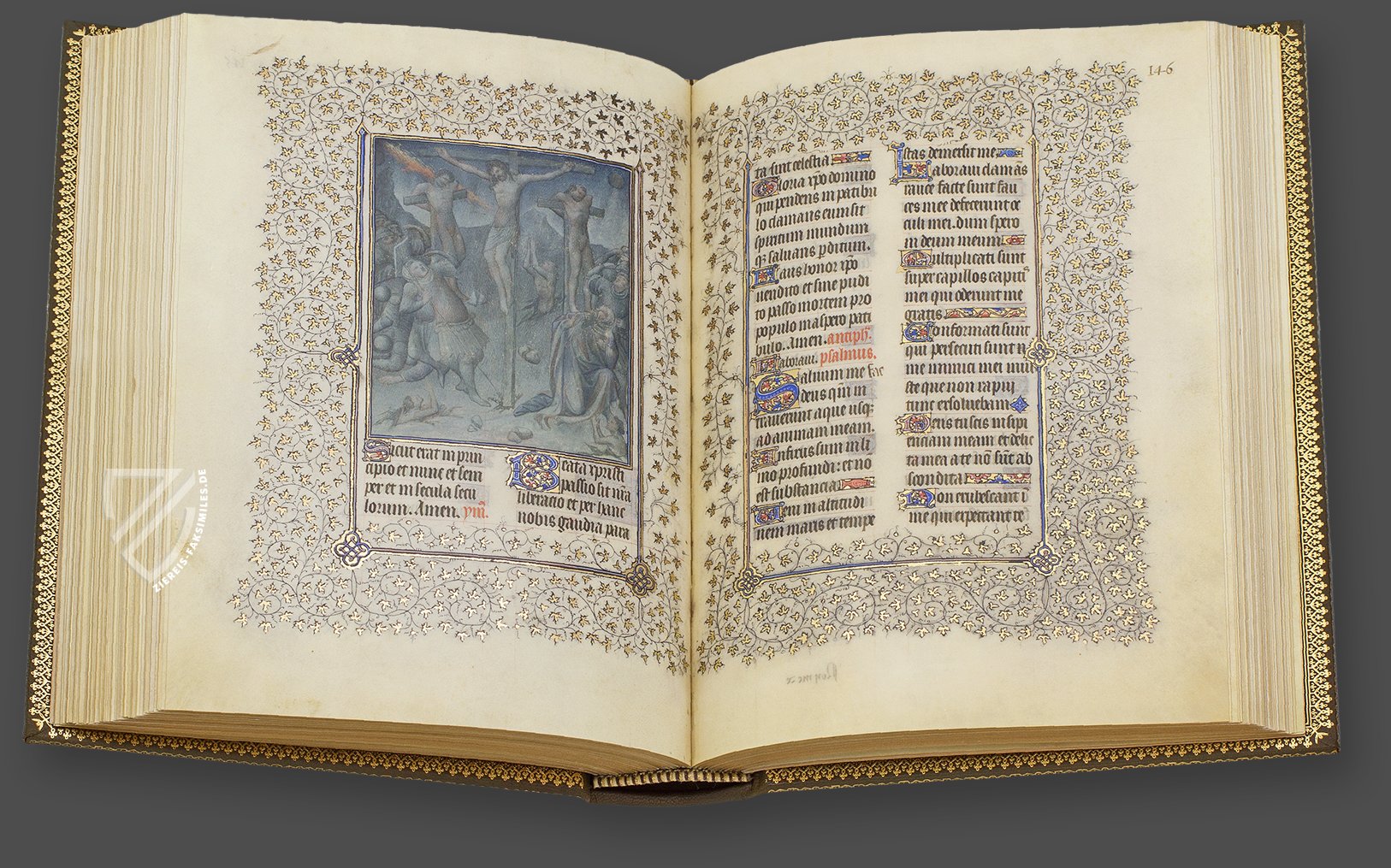 - 172 Miniaturen der BrĂŒder Limburg. Jede Miniatur und jede Seite des Textes wird durch dekoratives, filigranes Rankenwerk mit bis zu 500 in Gold leuchtenden EfeublĂ€ttern umgeben