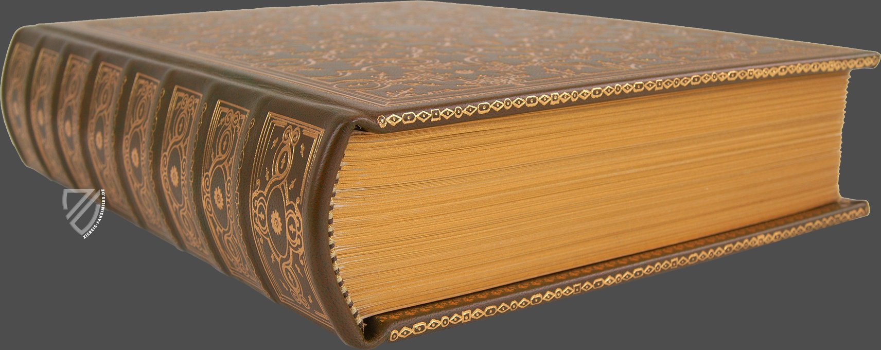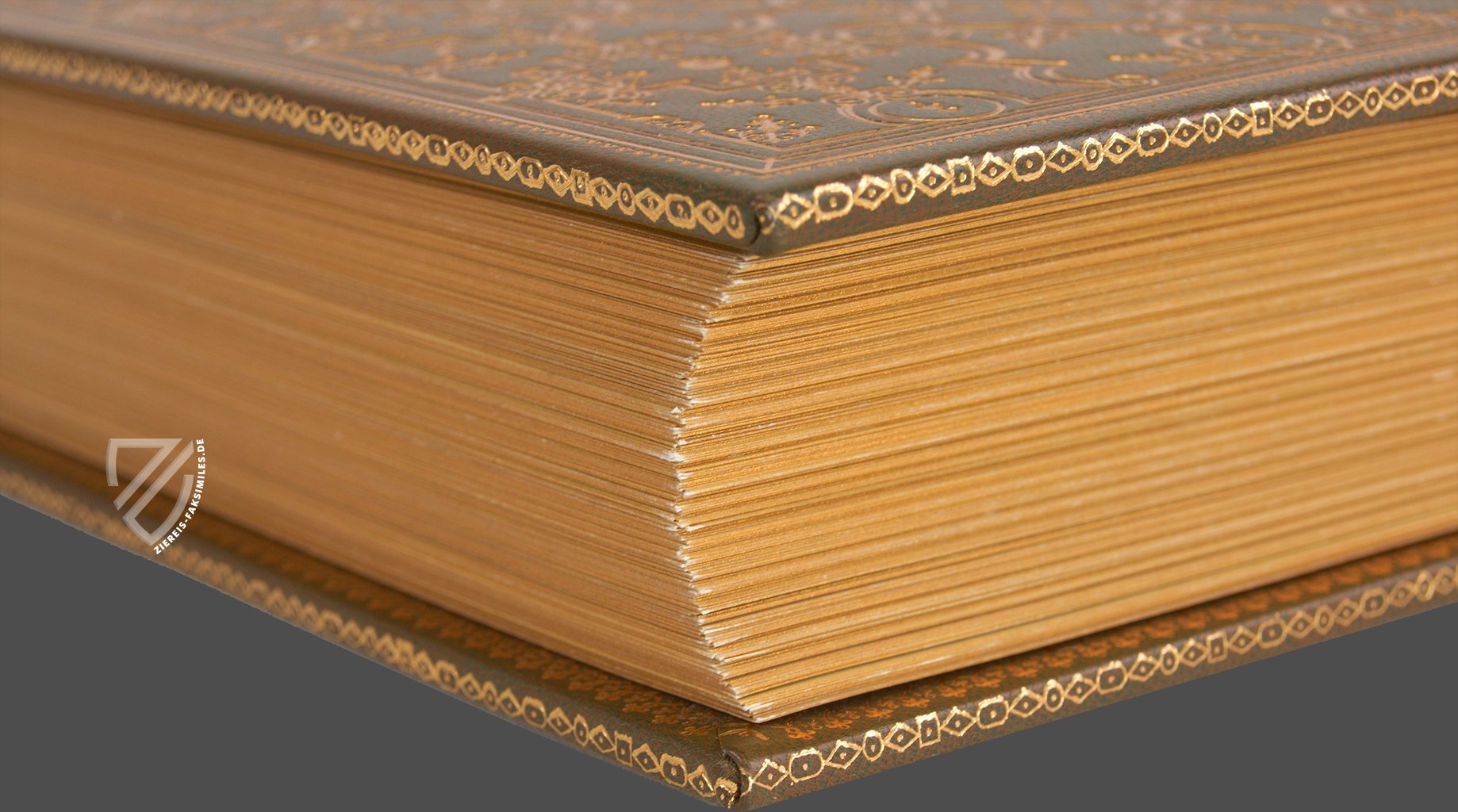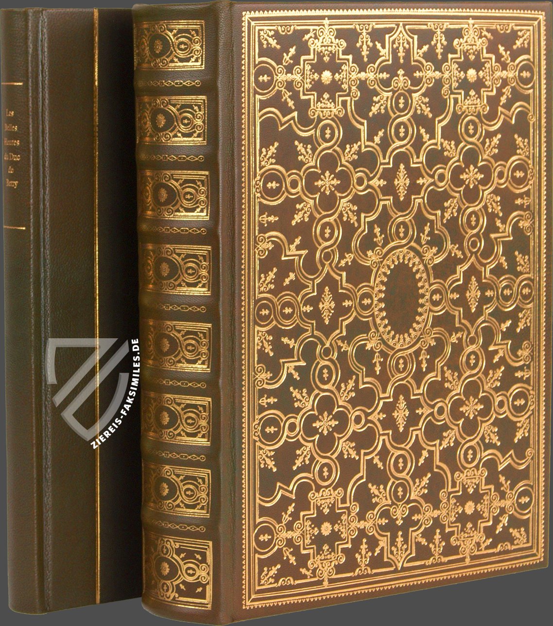 - 172 Miniaturen der Brüder Limburg. Jede Miniatur und jede Seite des Textes wird durch dekoratives, filigranes Rankenwerk mit bis zu 500 in Gold leuchtenden Efeublättern umgeben