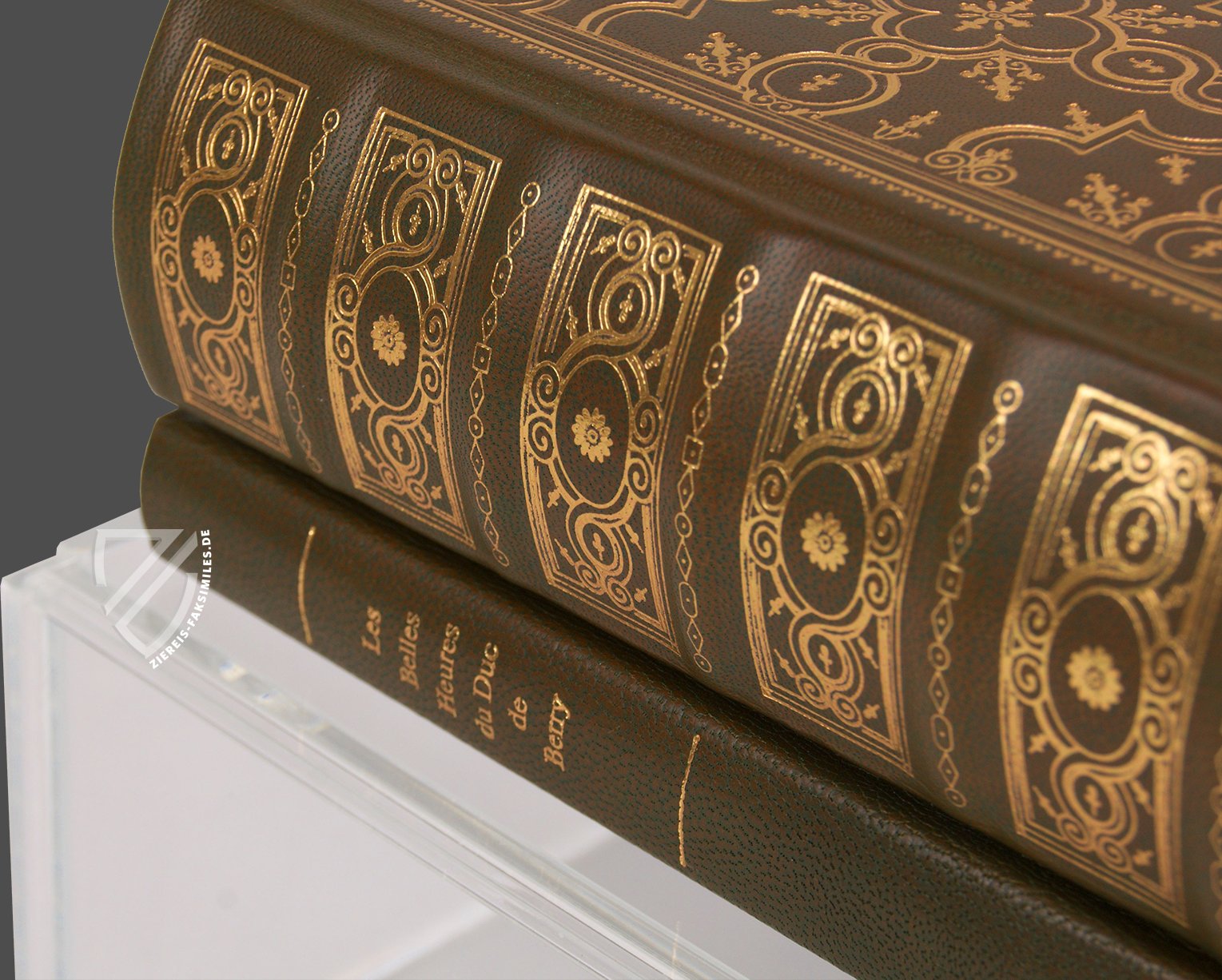 In einer einmaligen Zusammenarbeit der drei Buchkünstler mit ihrem außerordentlich großzügigen Auftraggeber entstand eine der fantastischsten Bilderhandschriften in der französischen Geschichte. Die 172 Miniaturen der „Belles Heures“ erstrahlen in einer nie zuvor gesehenen Farbpracht und sind geradezu verschwenderisch mit kostbarem Blattgold geschmückt. Jedes aufregend lebendige Bild und ebenso jede Textseite des Werkes ist umgeben von herrlich schimmernden Zierranken und Efeublättern. Unzählige leuchtend funkelnde Dekorelemente leiten wichtige Textpassagen ein und mehrzeilige Zierinitialen in den Farben des herzoglichen Wappens – Rot, Blau und Gold – runden den prachtvollen Eindruck der Handschrift ab. Beeindruckende, noch nie in vergleichbarer Form dargestellte Bilder prägen den Miniaturschmuck des Stundenbuches. So spiegelt ein Bilderzyklus von vier Miniaturen die große Verehrung Jean de Valois´ für seinen Namenspatron Johannes den Täufer wieder. Keine andere illuminierte Handschrift jener Zeit enthält einen ähnlichen Miniaturenzyklus. Somit sorgt nicht nur die aufwendige Gestaltungsvielfalt, sondern auch die Wahl der Bildmotive der „Belles Heures“ dafür, dass das Werk für immer ein unübertroffenes Unikat in der Geschichte der Buchmalerei bleibt.