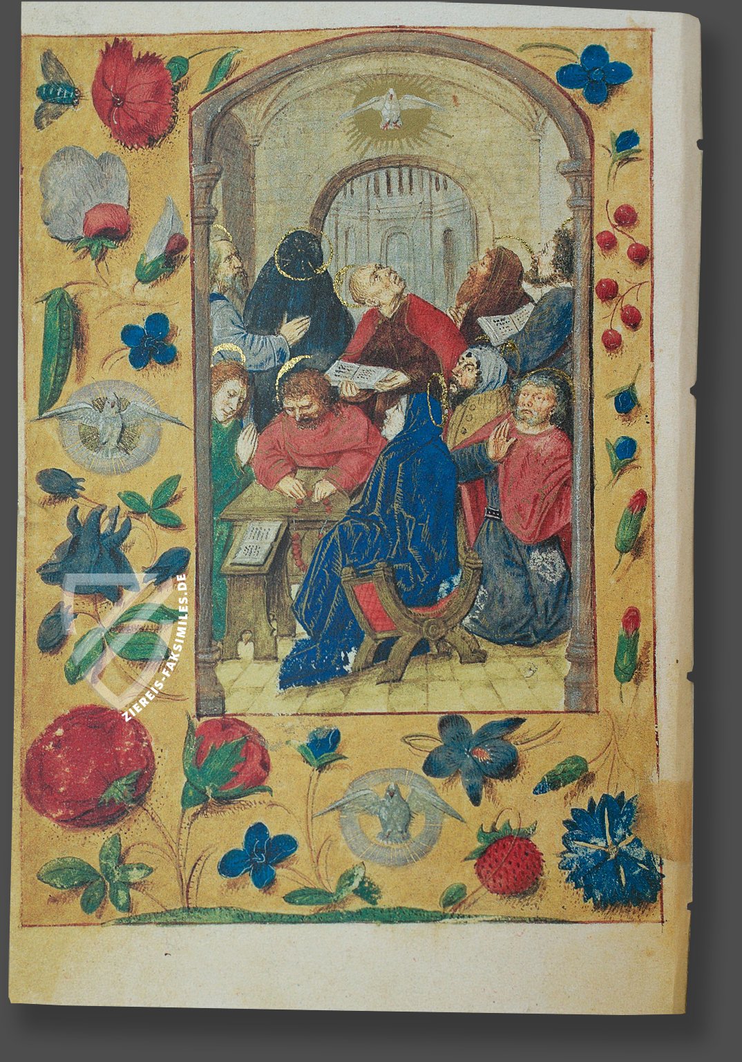 Mutter und Kind hat nicht jeder für sich einen Heiligenschein, sondern beide teilen sich einen subtil gezeichneten goldenen Nimbus. Mit dieser eher introvertiert gehaltenen Miniatur kontrastiert wunderbar ein üppiger goldener Rahmen, der mit roten Nelken, weißen Lilien, blauen Iris- und Glockenblumen und vielem mehr gefüllt ist. Ein Vogel und verschiedene Insekten runden diese wunderschönen Marginalien ab.