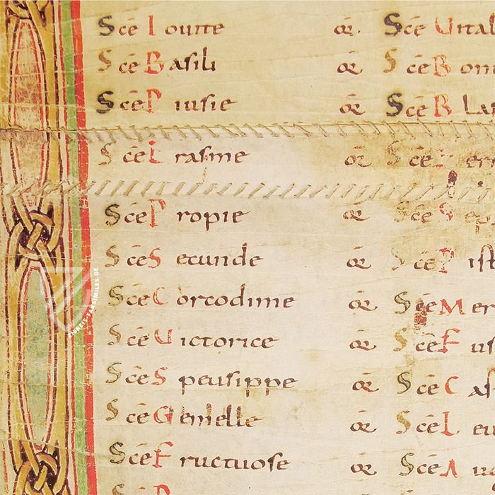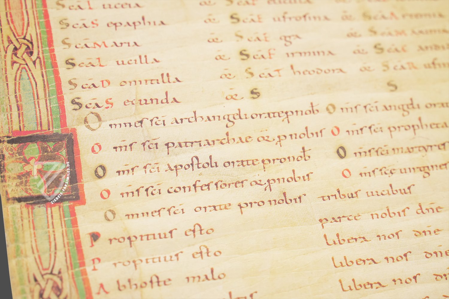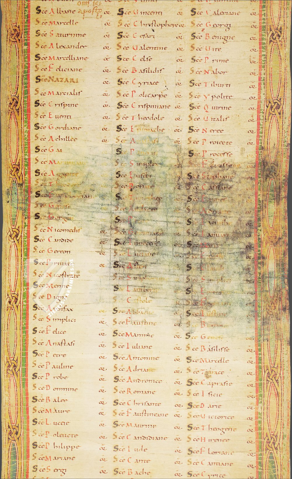 534 Namen von Heiligen sind in drei Spalten aufgelistet und in karolingischer Minuskel mit brauner Tinte geschrieben. Der erste Buchstabe jeder Zeile ist abwechselnd mit goldener und silberner Tinte geschrieben, wobei letztere oxidiert und schwarz geworden ist. FĂŒr den ersten Buchstaben eines jeden Heiligennamens wurde rote Tinte verwendet. Der fĂŒr dieses Werk verantwortliche Schreiber war der Forschung nach auch an der Entstehung von zwei luxuriösen Sakramentarhandschriften aus dem Skriptorium der Abtei Lorsch beteiligt.