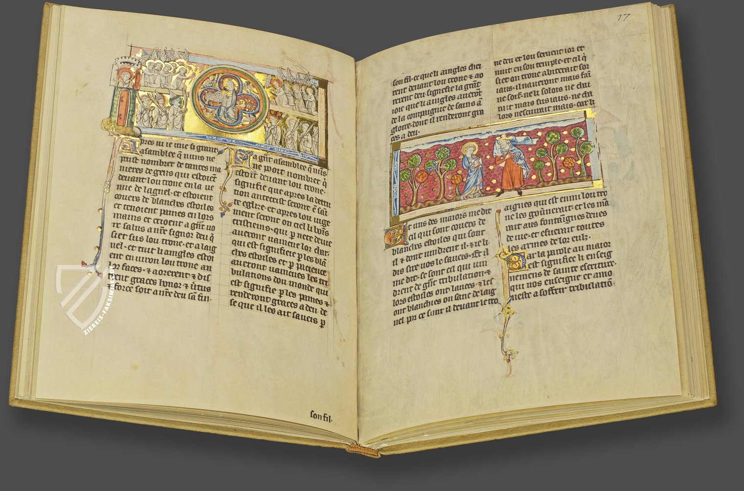 Das Buch der Offenbarung, im Mittelalter besser bekannt als Apokalypse, ist eines der rĂ€tselhaftesten und faszinierendsten BĂŒcher der Bibel und bot Buchmalern und Miniaturisten wunderbare Möglichkeiten, ihr kĂŒnstlerisches Talent zum Ausdruck zu bringen. Die fantastischen Bilder dieser oft furchterregenden Ereignisse brachten einige der groĂartigsten Werke der mittelalterlichen Kunst hervor, darunter auch dieses groĂartige Meisterwerk der gotischen Buchmalerei. 72 farbenprĂ€chtige Miniaturen mit prachtvollen HintergrĂŒnden aus schimmerndem Blattgold oder aufwĂ€ndigen Mustern veranschaulichen die wundersamen Ereignisse. AuĂergewöhnlich ist zudem, dass das Werk nicht in Latein, sondern im mittelalterlichen lothringischen Dialekt fĂŒr einen vermutlich weltlichen Auftraggeber in Metz verfasst wurde. Damit handelt es sich nicht nur um ein exemplarisches Dokument gotischer Buchmalerei und des verbreiteten Genres der Apokalypse-Handschriften, sondern auch um ein fĂŒr sich stehendes Kunstwerk.