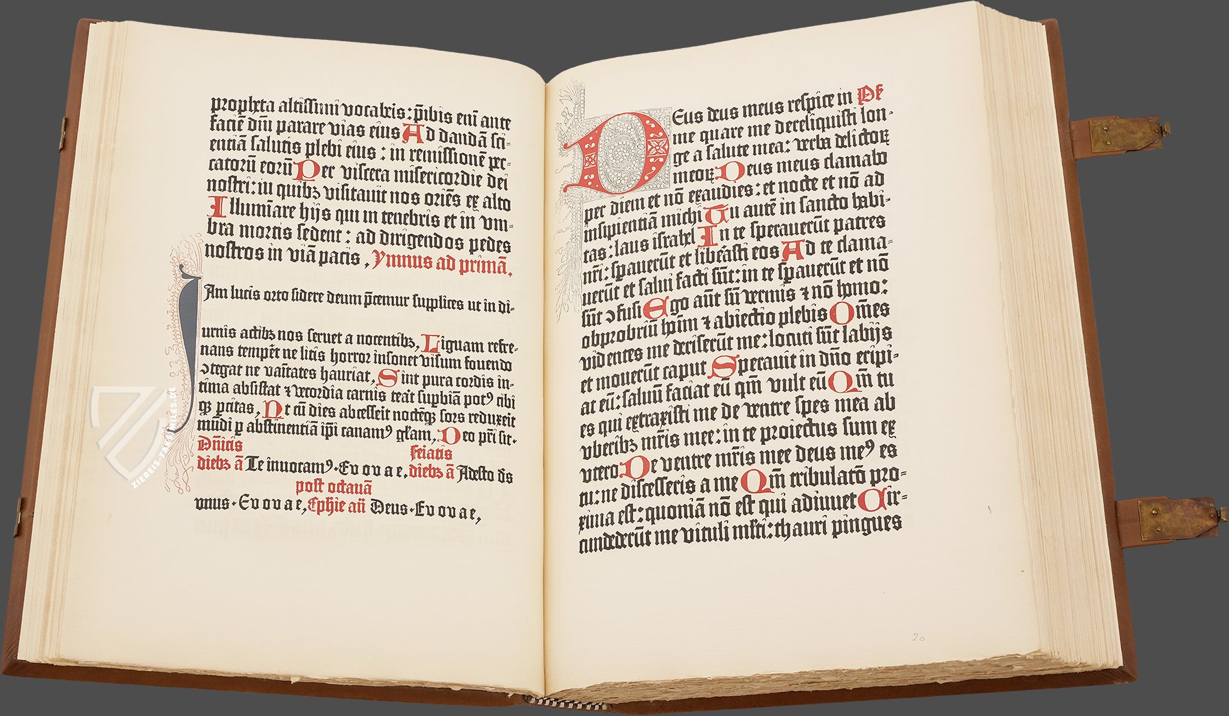 Der 1457 vom Mainzer Erzbischof in Auftrag gegebene Mainzer Psalter ist nach der Gutenberg-Bibel das zweite große gedruckte Buch. Er wurde von zwei ehemaligen Mitarbeitern Johannes Gutenbergs, Johann Fust und Peter Schöffer, geschaffen und war die erste Veröffentlichung ihrer neuen Werkstatt. Das Werk ist in vielerlei Hinsicht ein Novum in der Geschichte des Buchdrucks: Es war das erste Buch, das ein gedrucktes Kolophon mit Datum, Drucker (Schöffer) und Verleger (Fust) sowie zwei Schriftgrößen und gedruckte Zierinitialen aufwies, und es ist das erste Buch, das in drei Farben – Schwarz, Rot und Blau – gedruckt wurde. Der Text ist in Schwarz und Rot gedruckt und mit zahlreichen roten und blauen Holzschnittinitialen versehen. Doch diese Technik wurde bald wieder aufgegeben, weil das Setzen und Umstellen der verschiedenfarbigen Schriften zu zeitaufwendig war. Der Mainzer Psalter stellt somit ein ausgesucht seltenes Beispiel für dieses Verfahren dar. Die meisten frühen Druckwerke ließen weiterhin Leerstellen für Künstler, die Initialen und andere dekorative Elemente von Hand zeichneten. Heute sind 13 Exemplare des auf Pergament gedruckten Buches bekannt, darunter dieses Exemplar aus der Österreichischen Nationalbibliothek.