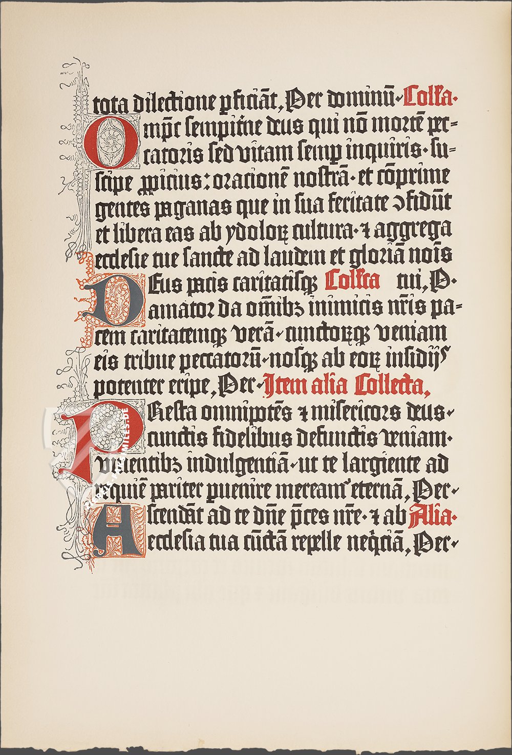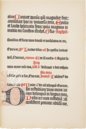 Die Ausstattung dieser Seite ist typisch für die Handschrift: Der sauber gedruckte Text mit gleichmäßigen Rändern ist mit einer großen roten "D"-Initiale mit wirbelnden, paisleyartigen Mustern und Blumen, einer kleineren blauen "E"-Initiale mit pflanzlichen Mustern und neun kleineren roten Initialen versehen. Obwohl die Seite aus der ersten Generation der gedruckten Bücher stammt, ist sie bemerkenswert gut ausgeführt und gleichmäßig gestaltet.