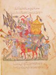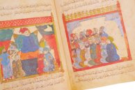 Diese Handschrift stellt gleichzeitig das schÜnste erhaltene Exemplar der Maqamat Al-Hariri oder der Versammlungen von Al-Hariri dar und enthält auch einige der berßhmtesten Bilder des täglichen Lebens in der mittelalterlichen islamischen Welt. Das Werk von Al-Hariri von Basra (1054-1122) besteht aus 50 Kurzgeschichten, die in der gesamten arabischen Welt spielen. Das vorliegende Exemplar wurde von Yahya ibn Mahmud al-Wasiti, einem irakischen Maler und Kalligraphen des 13. Jahrhunderts, transkribiert und illustriert. Die 99 Miniaturen, die mit einer vielfältigen Farbpalette und Blattgold lebendig, aber subtil wiedergegeben werden, lassen sich heute in fast allen Bßchern ßber mittelalterliche islamische Kunst und Kultur finden. Das Manuskript, das von al-Wasiti zwischen 1236 und 1237 im Sßdirak geschaffen wurde, ist konkurrenzlos unter den Handschriften, die von diesem beliebten Text erstellt wurden. Der Text taucht in Handschriften so weit entfernter Länder wie Spanien auf und wurde bis ins 18. Jahrhundert hinein häufig in illuminierten Manuskripten dargeboten.
