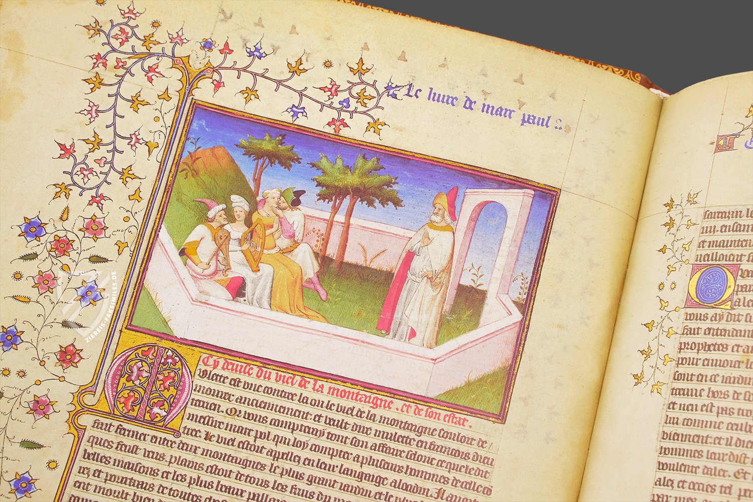 Die länglichen Figuren und weichen Falten sind typisch franzÜsisch, und die Architektur lässt einen zu wßrdigenden Versuch der perspektivischen Darstellung erkennen. Vor allem wird man sich aber in den Marginalien verlieren, die die Primärminiatur mit den farbenfrohen, mit Gold akzentuierten Ranken doch ßberstrahlen. Vier Medaillonminiaturen in je einem Vierpass zeigen an den Ecken Engel mit Schriftrollen und Tiere mit Wappen vor kunstvoll gemusterten Hintergrßnden.