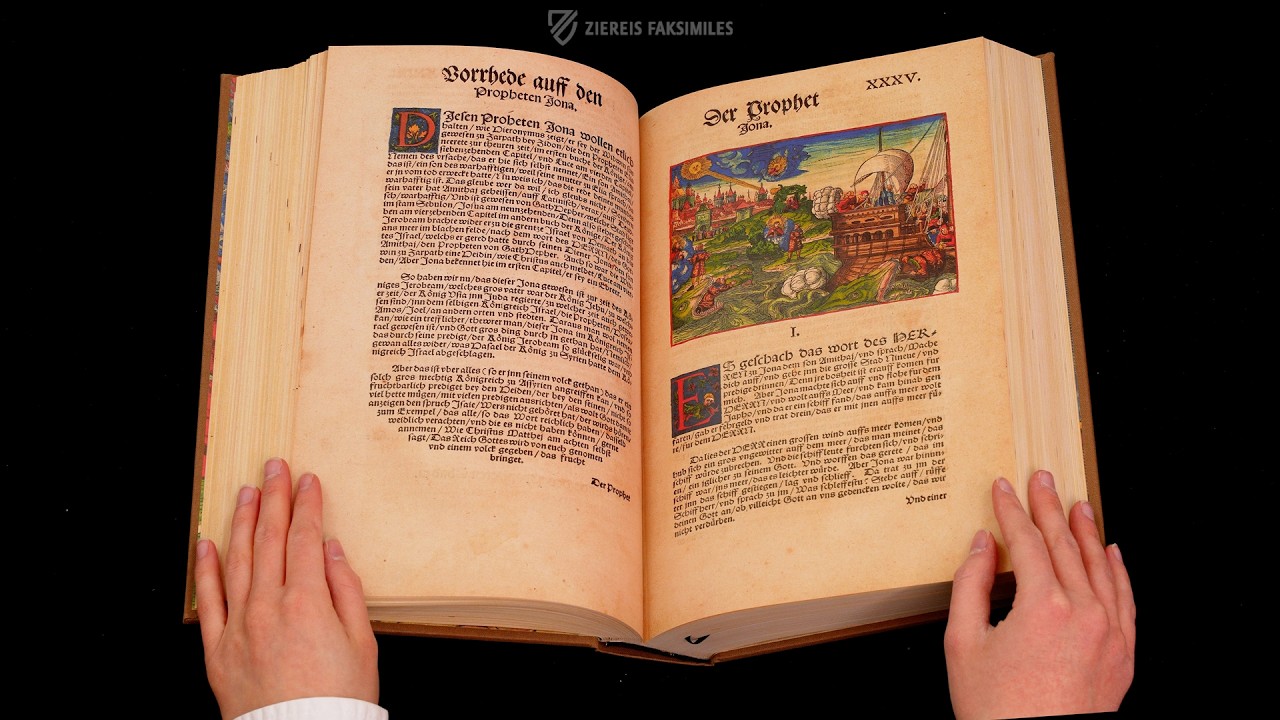 Nur wenige historische Persönlichkeiten haben eine so weitreichende Wirkung gehabt wie Martin Luther (1483-1546). Die entscheidende Gestalt der protestantischen Reformation ist eine der wichtigsten Persönlichkeiten in der Geschichte Deutschlands und der deutschen Sprache, weil er die Bibel so übersetzt hat, dass sie auch von Laien verstanden werden konnte. Nach der Erstveröffentlichung des Neuen Testaments im Jahr 1522 folgte 1534 eine Gesamtausgabe des Alten und Neuen Testaments mit Apokryphen. Von den 60 erhaltenen Exemplaren der ersten Gesamtausgabe ist das in der Herzogin Anna Amalia Bibliothek in Weimar aufbewahrte Exemplar zweifelsohne das beste. Seine 128 Holzschnitte sind reich mit blauen, roten und grünen Farben koloriert, einige sogar mit Gold. Der prächtige Druck muss von einer wohlhabenden Person in Auftrag gegeben worden sein, aber es konnte bisher niemand namentlich identifiziert werden. Über die Besitzverhältnisse vor dem Erwerb durch die Bibliothek im Jahr 1815 ist gleichfalls nichts bekannt.
