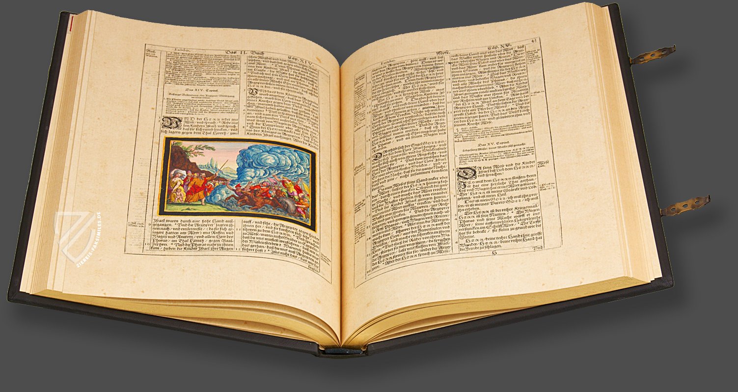 Der Text des Alten Testaments, gedruckt in einer eleganten Fraktur-Schrift, ist mit 157 kolorierten Kupferstichen geschmĂŒckt, die von Kunsthistorikern als einige der schönsten jemals geschaffenen angesehen werden. Die mit Goldschnitt versehenen Seiten des Codex befinden sich in einem harten Ledereinband mit GoldprĂ€gung, MetallschlieĂen und EckbeschlĂ€gen. Merian gilt als einer der bedeutendsten Vertreter der neuen grafischen KĂŒnste, die durch den Buchdruck möglich wurden. Seine Stiche zeichnen sich durch eine Kombination von Detail, Feinheit und Lebendigkeit aus und machen diese Bibel zu einem der faszinierendsten Exemplare einer gedruckten Bibel aus dem 17. Jahrhundert.