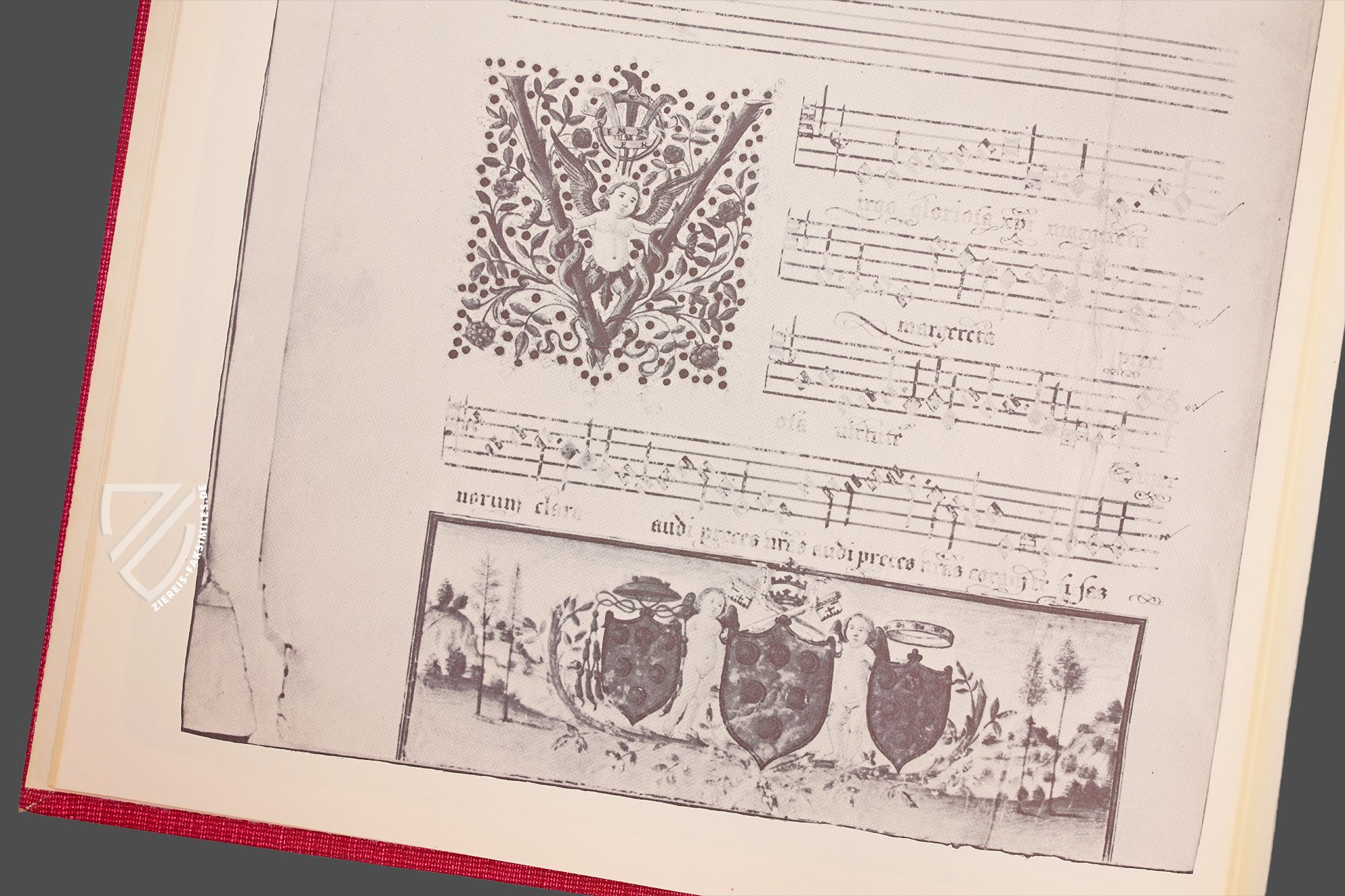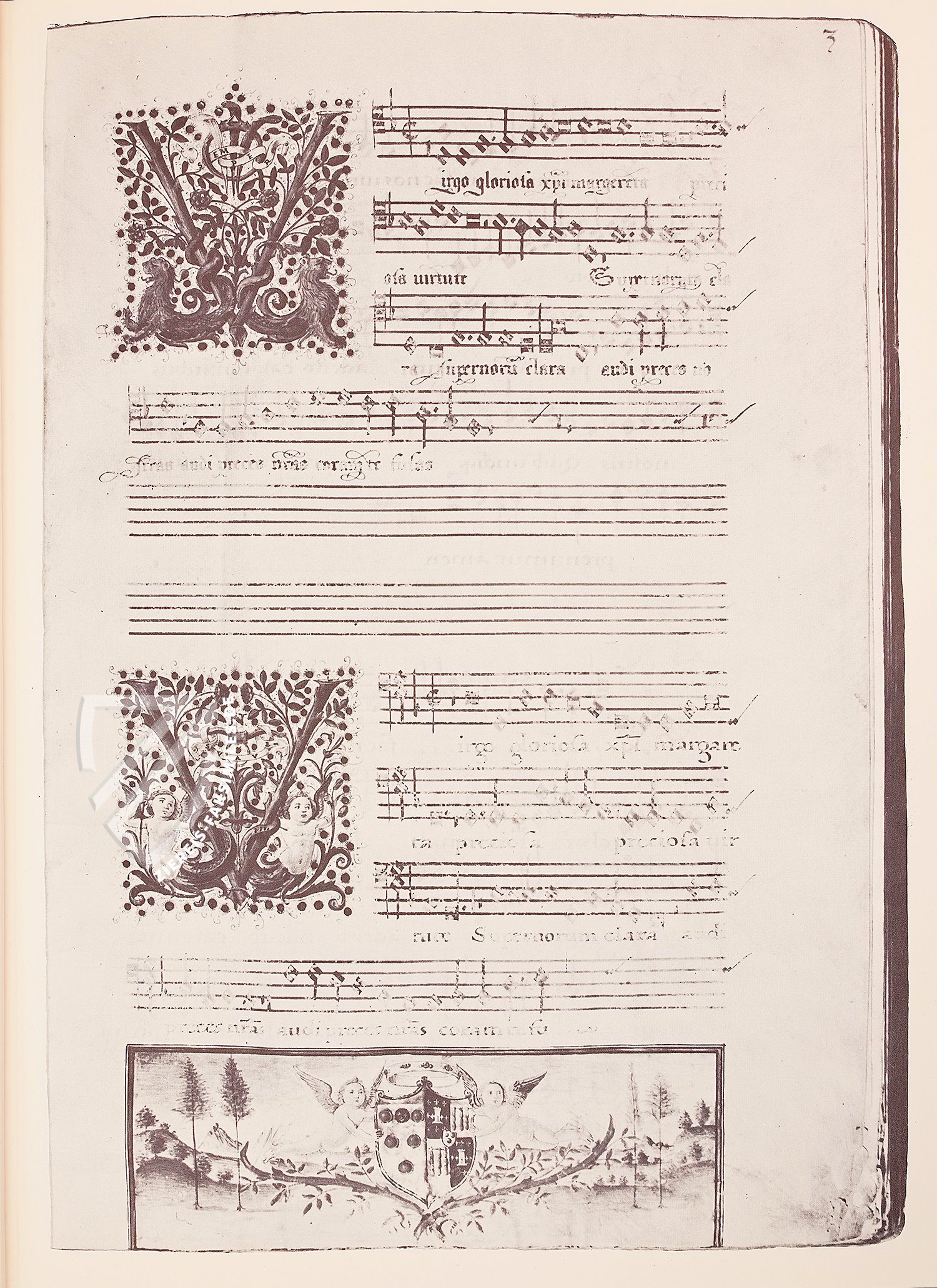 Die wunderbare Bas-de-page-Miniatur auf fol. 2v zeigt drei durch eine Blattranke verbundene Wappen, die vor einer verträumten Landschaft schweben. Zwei Putti flankieren das mittlere, etwas größere Wappen, das von einer Tiara und zwei gekreuzten Schlüsseln gekrönt ist – die heraldischen Symbole der Papstwürde. Währenddessen repräsentiert das linke Wappen mit seinem Kardinalshut als Rangkrone die Kardinalswürde und das rechte den weltlichen Rang als Graf.