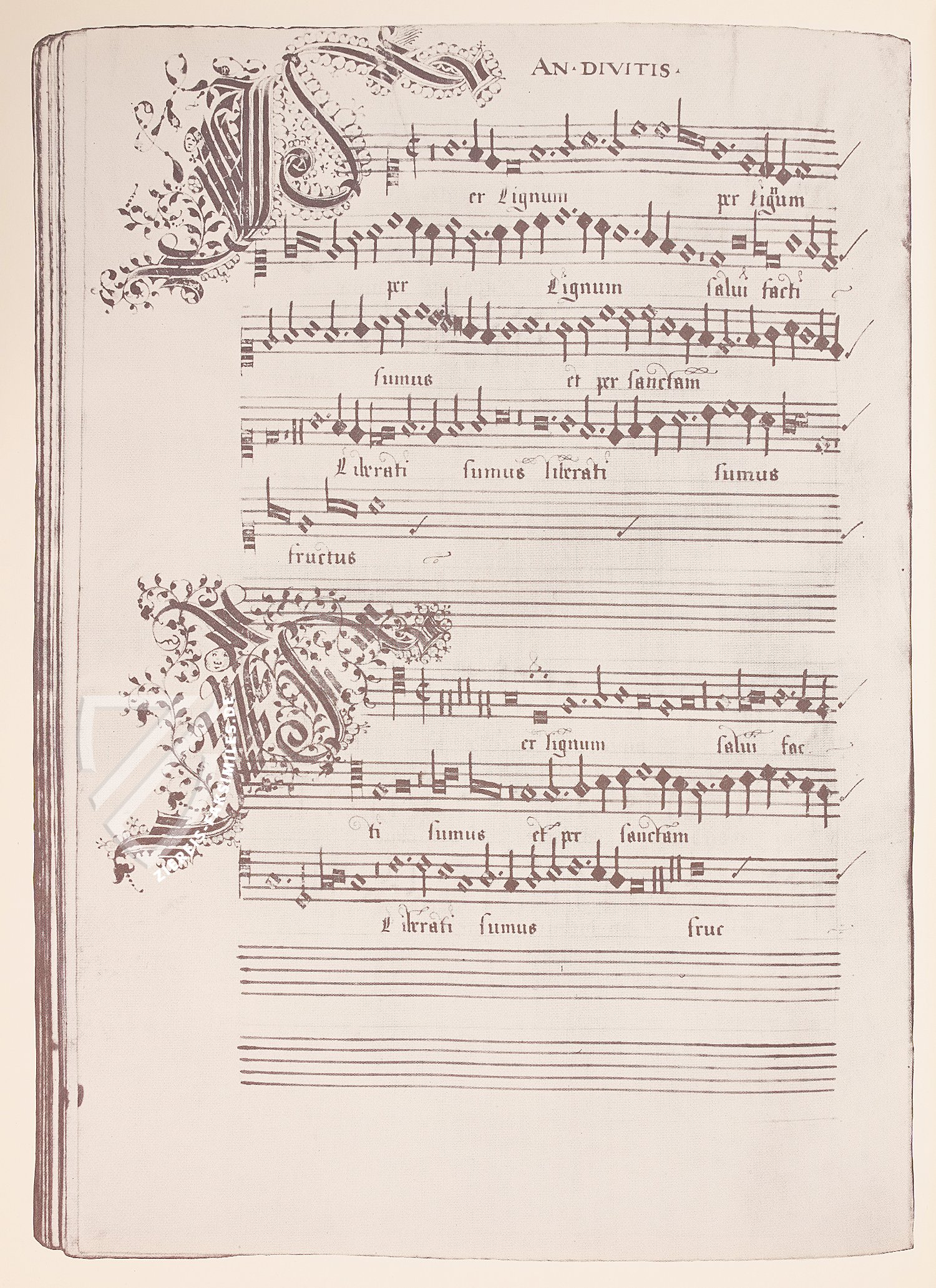 Alle drei Wappen gehören zur Person Leos X., dem Medici-Papst, der die Handschrift in Auftrag gab. So finden sich auf jedem der drei Wappen die typischen sechs roten Kugeln des Familienwappens. Hinzu kommt das Spruchband in der filigran ornamentierten Zierinitiale darüber, das die Devise der Medici präsentiert: „SEMPER“ – dt.: „immer“.