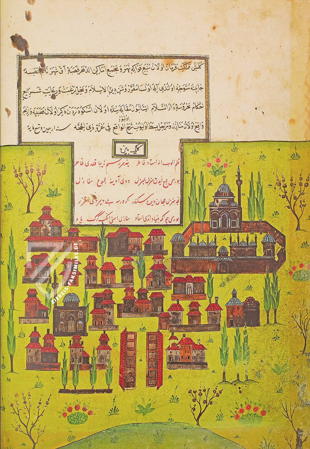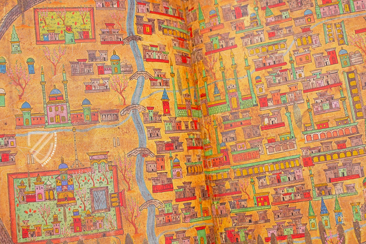 Sultan Süleyman I. (1494-1566), bekannt als "Süleyman der Prächtige", regierte das Osmanische Reich in seiner Blütezeit und feierte zahlreiche Siege über die Feinde der Türken im Westen wie im Osten. Der erste Feldzug des Sultans gegen die Perser im Osmanisch-Safawidischen Krieg von 1532-1555 ist in der prächtig illuminierten Beyan-ı Menazil-i Sefer-i Irakeyn-i Sultan Süleyman Han oder der "Chronik der Etappen des Feldzuges von Sultan Süleyman Khan im Irak und in Persien" dokumentiert. Sie wurde 1537 fertiggestellt und ist das Werk des großen Universalgelehrten Matrakçı Nasuh (ca. 1480 - ca. 1564), der nicht nur auf unterschiedliche Jahreszeiten und Landschaften achtete, sondern tatsächlich auch 107 Landschaften und Stadtansichten mit großer Detailtreue darstellte.