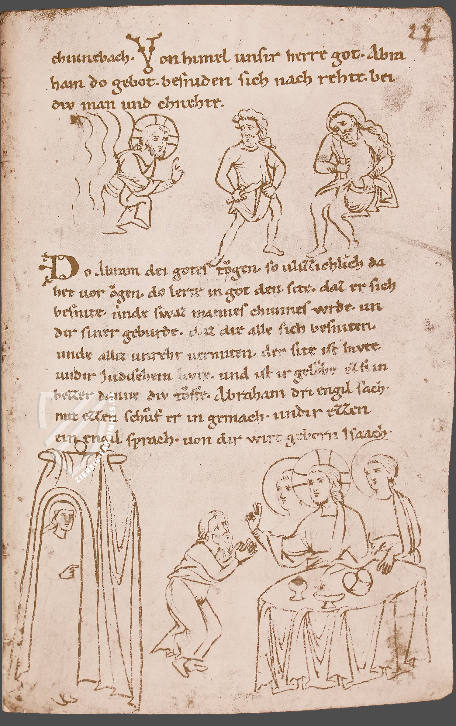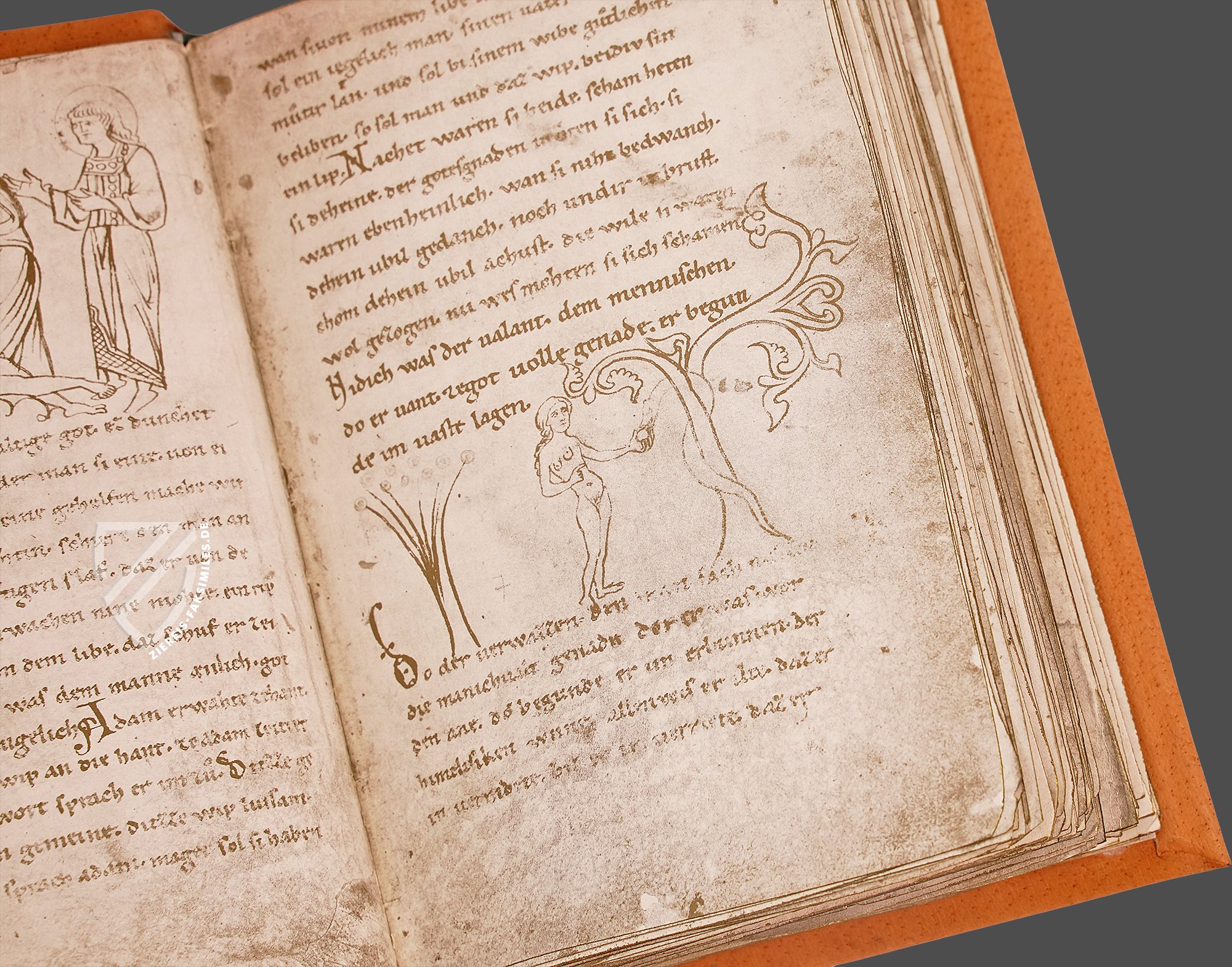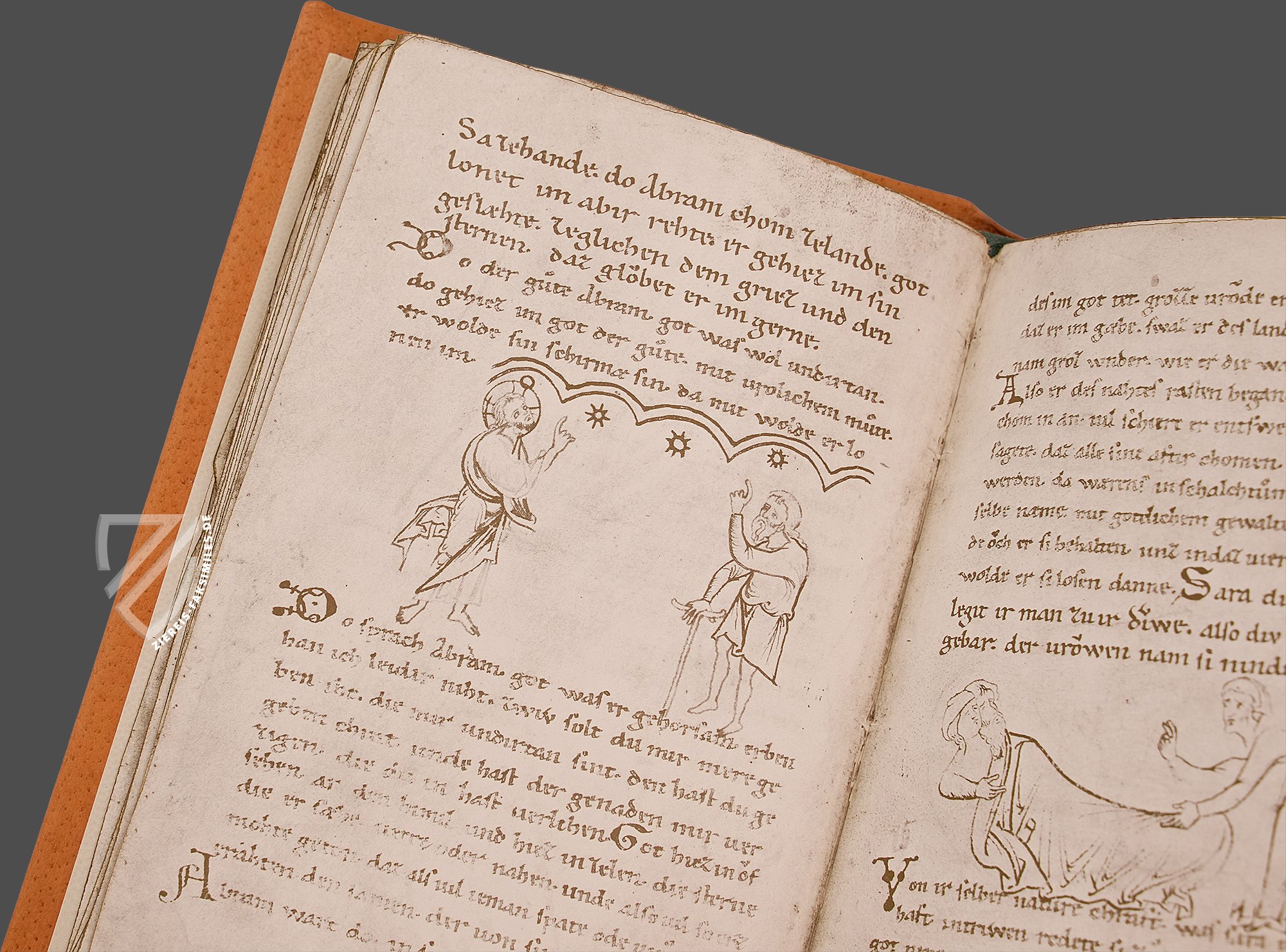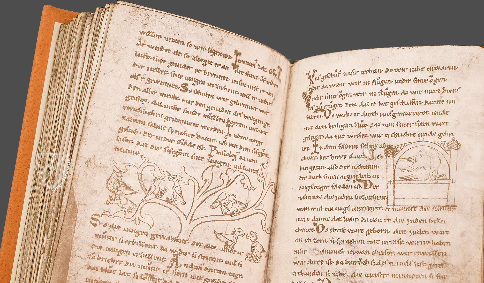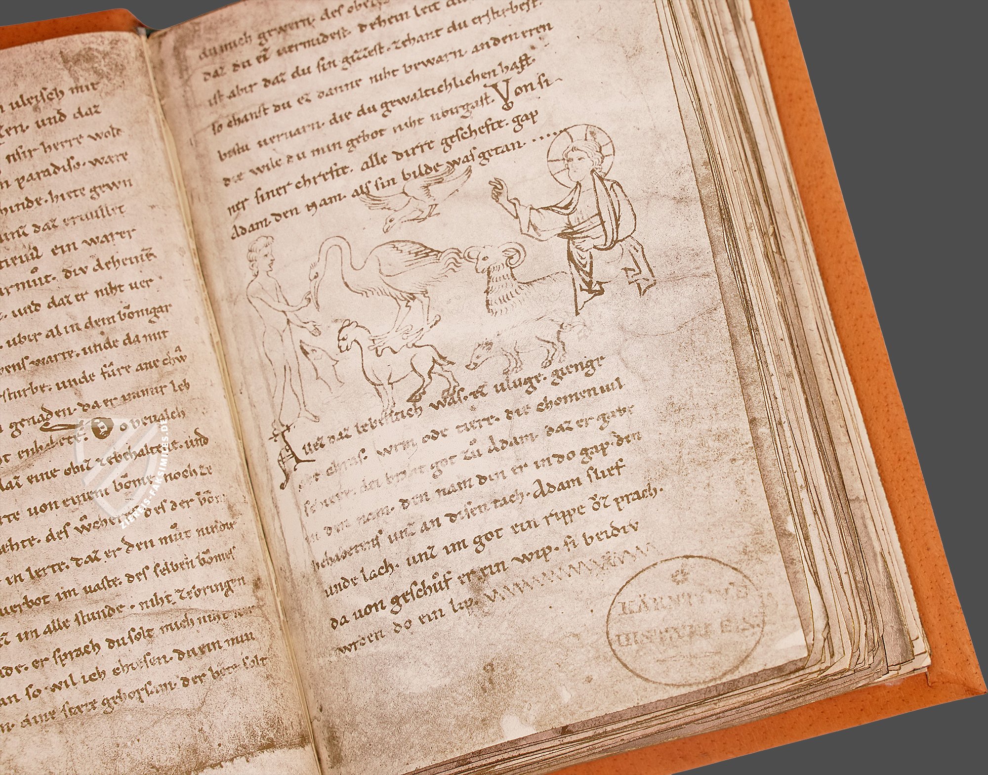 Die MillstĂ€tter Genesis- und Physiologus-Handschrift zeichnet sich vor anderen durch insgesamt 119 fein kolorierte Federzeichnungen in roter, blauer und brauner Farbe aus, welche die ersten beiden Gedichte â Genesis und Physiologus â illustrieren.