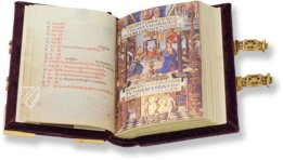 Das Mirandola Stundenbuch entstand zwischen 1496 und 1499 im italienischen Mantua oder Ferrara und ist ein Glanzstück der Renaissance-Buchmalerei. Galeotto Pico I. (1442–1499) gab als Herr von Mirandola den Auftrag zu dem Buch, dessen Texte zur privaten Andacht von insgesamt vier ganzseitigen und sieben kleineren Miniaturen ergänzt wird. Desweiteren finden sich auf den 228 Seiten ein Kalender mit Monats- und Tierkreiszeichenbildern, sechs Initialen mit szenischen Darstellungen, 85 Initialen vor reizenden Landschaften und weitere 37 Initialen mit erfinderischen großflächigen Ornamenten. Verantwortlich für diesen Reichtum an prächtigen Malereien ist wohl der italienischen Renaissancemaler Giovanni Francesco Maineri, der hauptsächlich für die Familie Este tätig war. Vor allem seine die Seiten komplett ausfüllenden leuchtenden Miniaturen mit ihren detailreichen Innenräumen laden zur näheren Betrachtung ein.