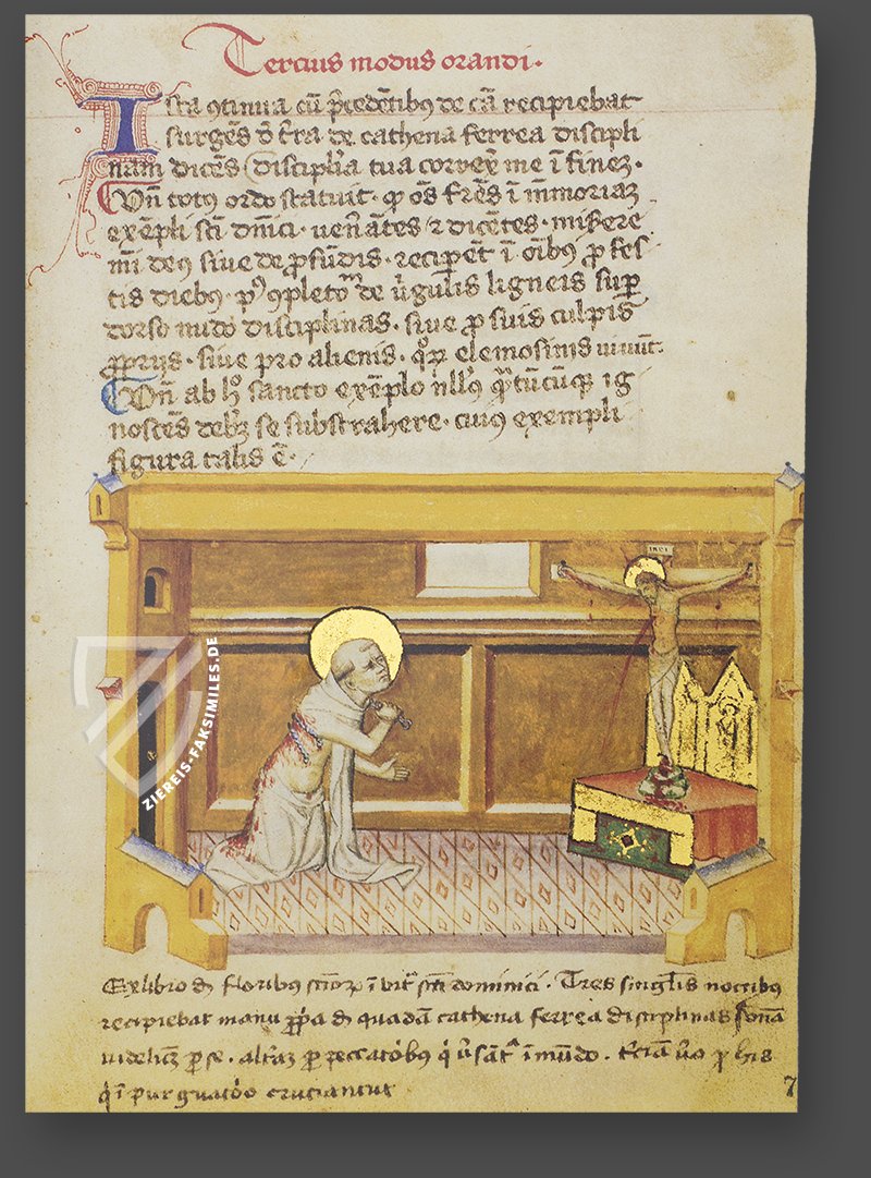 Wie die meisten Miniaturen in diesem Codex wird diese Szene in einen wunderschönen Innenraum verlegt – es scheint fast so, als ob die vierte Wand entfernt worden wäre. Dominikus kniet auf einem Boden mit Rautenmuster und wird mitten in einem Schlag mit blassem und frommem Gesichtsausdruck gezeigt. Er trägt Weiß, das aber mit seinem Blut fast überdeckt wird; das Kruzifix, das ihm gegenübersteht, blutet ebenfalls. Es wird wenig Farbe verwendet, meistens Brauntöne, aber Heiligenscheine und Altar sind mit Blattgold hervorgehoben.