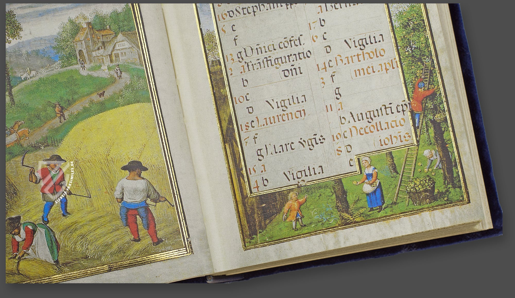 Mit seinen 14 mal 10 Zentimetern wirkt das Müchner-Montserrat Stundenbuch zunächst ganz unscheinbar. Entstanden ist es wohl im Auftrag von Alonso de Idiaquez (1497–1547), welcher königlicher Sekretär von Carlos I. von Spanien war. Für die künstlerische Ausstattung war der flämische Miniaturmaler und Illustrator Simon Bening zuständig, der als Meister der europäischen Buchillustration gefeiert wird. Die 468 Seiten des Büchleins schmückte er mit 19 ganzseitigen Miniaturen sowie zahlreichen historisierten Initialen und auffälligen Bordüren mit floralen Mustern. Sein Hauptaugenmerk liegt auf der natürlichen Gestaltung der Landschaft. Dramatische Wellengänge oder sommerliche Wälder bilden die Kulisse für Bauern bei der Feldarbeit, beim Holzhacken oder beim Scheren der Schafe.