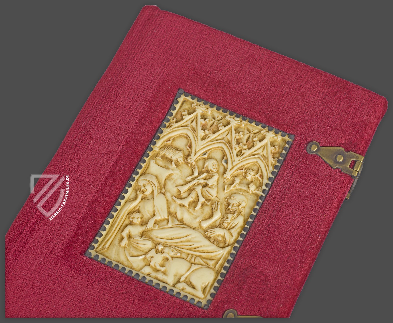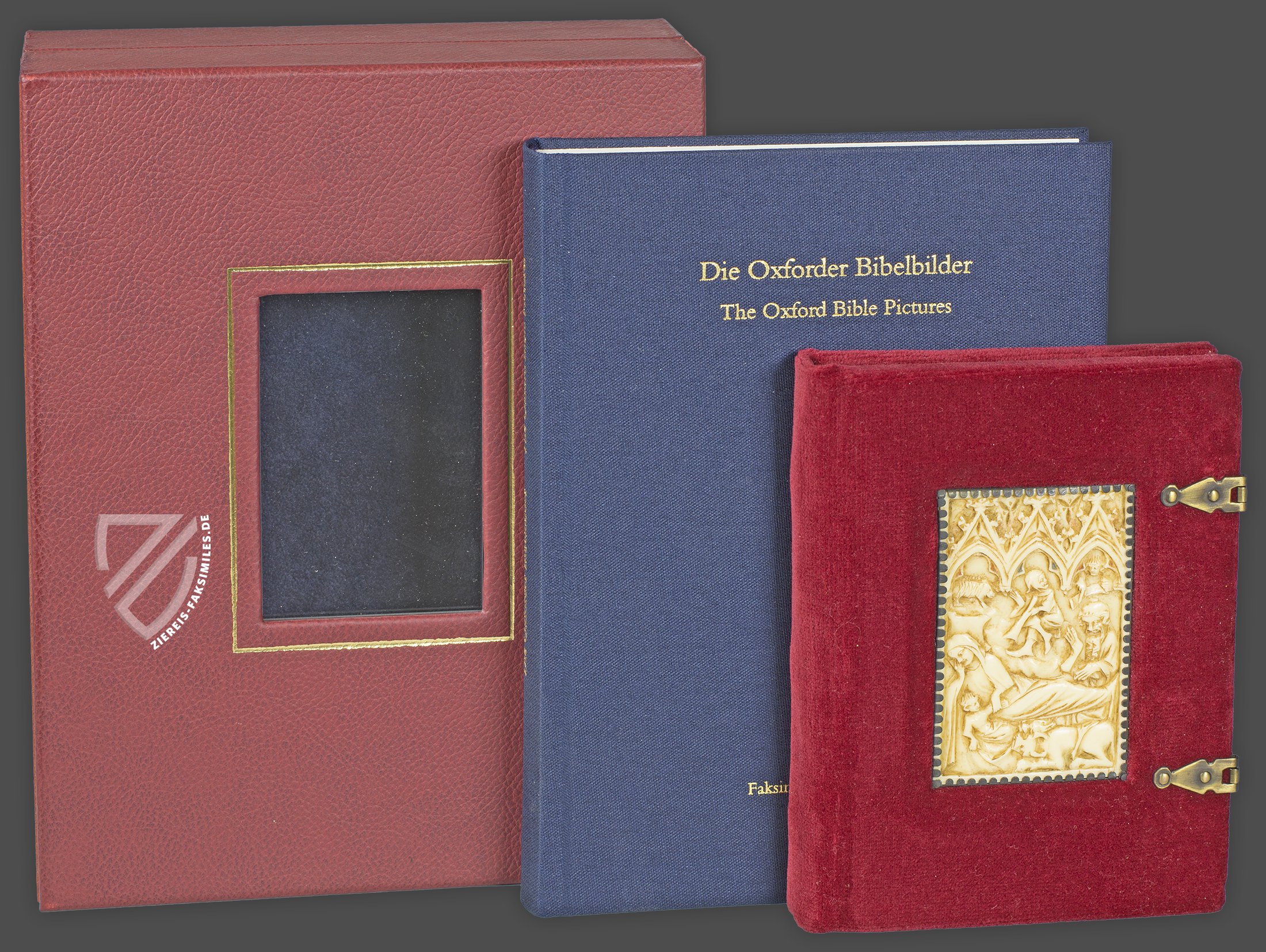 Ein weiteres Element, das zur BerĂŒhmtheit der Bibelbilder beigetragen hat, ist die filigran geschnitzte Elfenbeinplatte im vorderen Einband des Buches, welche am Ende des 14. Jahrhunderts in Deutschland angefertigt wurde. Die fragile Tafel ist beidseitig beschnitzt und zeigt in erstaunlicher PlastizitĂ€t vorne die Geburt, auf der RĂŒckseite die Kreuzigung Jesu Christi. An einigen Stellen ist sie so dĂŒnn gearbeitet, dass sie sogar Lichtstrahlen durchlĂ€sst. Weder die genaue Funktion noch der Erschaffer dieses ganz eigenen Kunstwerkes konnte je genau bestimmt werden. Dieses Geheimnis verstĂ€rkt den Reiz, den die Oxforder Bibelbilder fĂŒr ihre Betrachter noch heute innehaben.