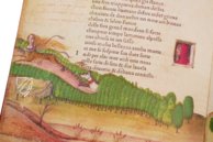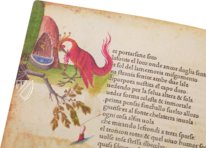 Doch hat der Petrarca Queriniano noch mehr zu bieten: er ist nicht nur eine wertvolle Inkunabel, sondern zudem noch wunderschön individuell illustriert. Verantwortlich für den verschwenderischen Buchschmuck war Antonio Grifo, ein venezianischer Poet und Miniaturist, der in der Literatur ironischerweise auch Dilettante queriniano genannt wird. In leuchtend bunten Farben und mit beeindruckender Kreativität und Phantasie füllte Grifo das Werk von der ersten bis zur letzten Seite aus. Dabei brachte er sowohl seine eigenen Deutungen zum Ausdruck, stellte aber auch Bezüge zur Petrarca-Illustrations-Tradition her. So entstanden wunderschöne figürliche Szenen zwischen grünen Bäumen und Wiesen, prächtige Initialen und zum Teil sogar mit Gold versehene Randzeichnungen.