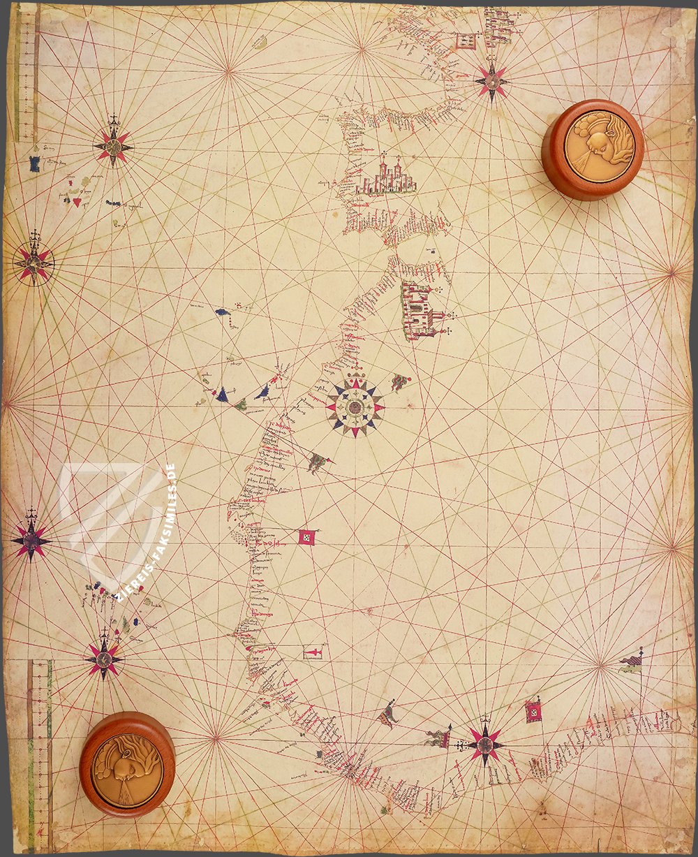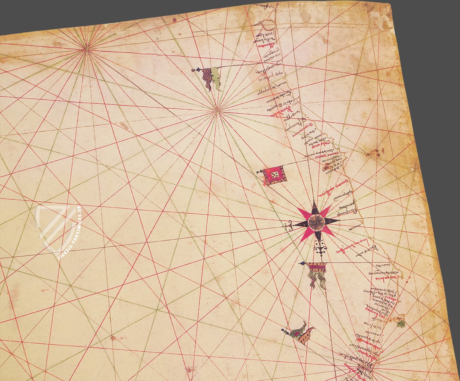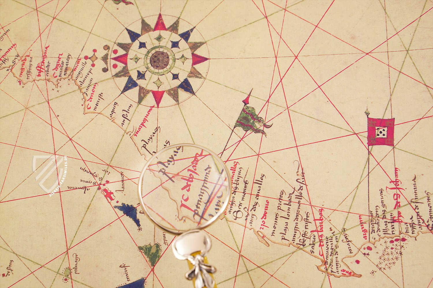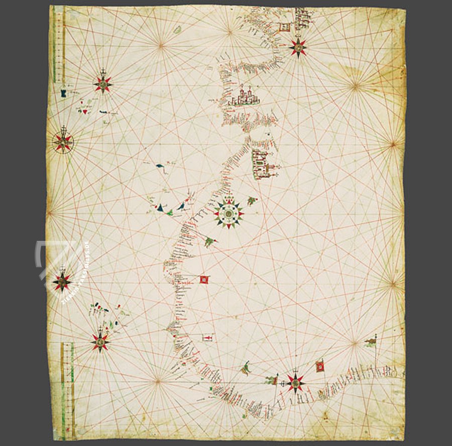 Im 15. Jahrhundert entwickelte sich Lissabon als Hauptstadt des Königreichs Portugal zu einem führenden Zentrum des Welthandels. Dem trägt auch diese Portolan-Karte Rechnung, die die Stadt, hier in roter Auszeichnungsschrift als vlixbona bezeichnet, ausnahmsweise mittels einer schematischen Darstellung hervorhebt. Besonders bemerkenswert ist der genaue Verlauf der Küstenlinie, die auch Flussmündungen berücksichtigt. Lissabon verschmilzt dabei regelrecht mit der Mündung des Flusses Tajo, an die es sich geografisch korrekt von Norden her anschmiegt. Weiter unten ist zudem die Meerenge von Gibraltar zu erkennen, während sich links der Atlantik erstreckt.