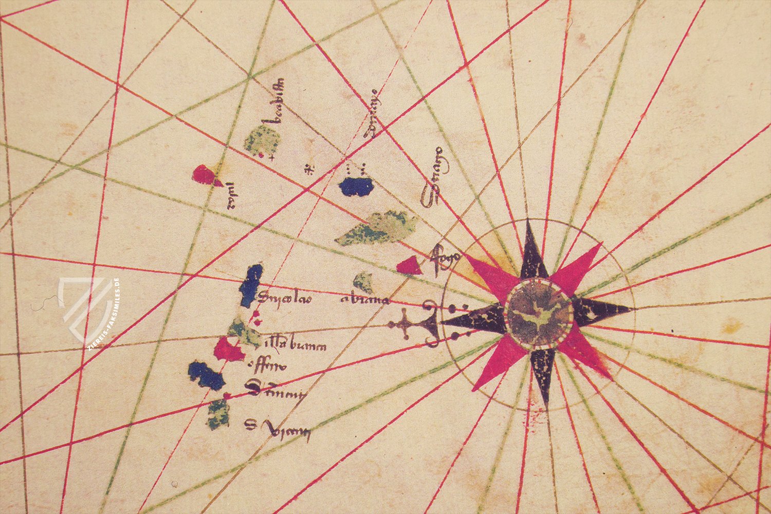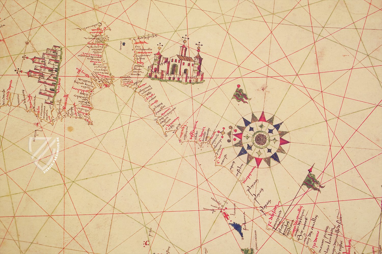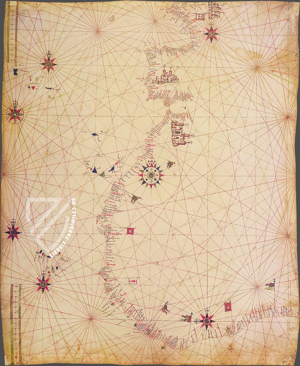 Im 15. Jahrhundert entwickelte sich Lissabon als Hauptstadt des Königreichs Portugal zu einem führenden Zentrum des Welthandels. Dem trägt auch diese Portolan-Karte Rechnung, die die Stadt, hier in roter Auszeichnungsschrift als vlixbona bezeichnet, ausnahmsweise mittels einer schematischen Darstellung hervorhebt. Besonders bemerkenswert ist der genaue Verlauf der Küstenlinie, die auch Flussmündungen berücksichtigt. Lissabon verschmilzt dabei regelrecht mit der Mündung des Flusses Tajo, an die es sich geografisch korrekt von Norden her anschmiegt. Weiter unten ist zudem die Meerenge von Gibraltar zu erkennen, während sich links der Atlantik erstreckt.