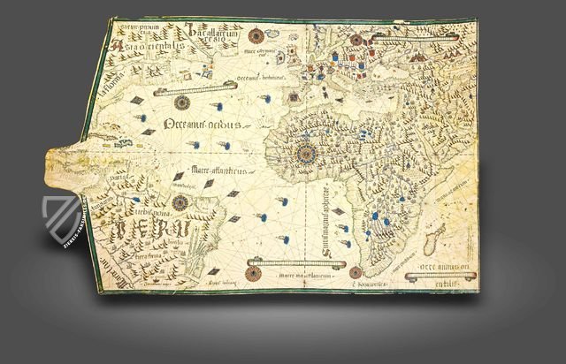 Afrika und die Ostküsten der Neuen Welt sind mit erstaunlicher Genauigkeit dargestellt, ganz ohne moderne Computermodelle oder Satellitenbilder. Gebirgszüge, Flüsse, Seen und Küstenlinien sind zwar auch detailliert eingezeichnet, aber recht unabhängig davon, ob sie der tatsächlichen Geografie so entsprechen oder nicht. Zahlreiche Schiffe sind auf den Ozeanen zu sehen, und die Königreiche Europas sind mit verschiedenen Wappen gekennzeichnet.
