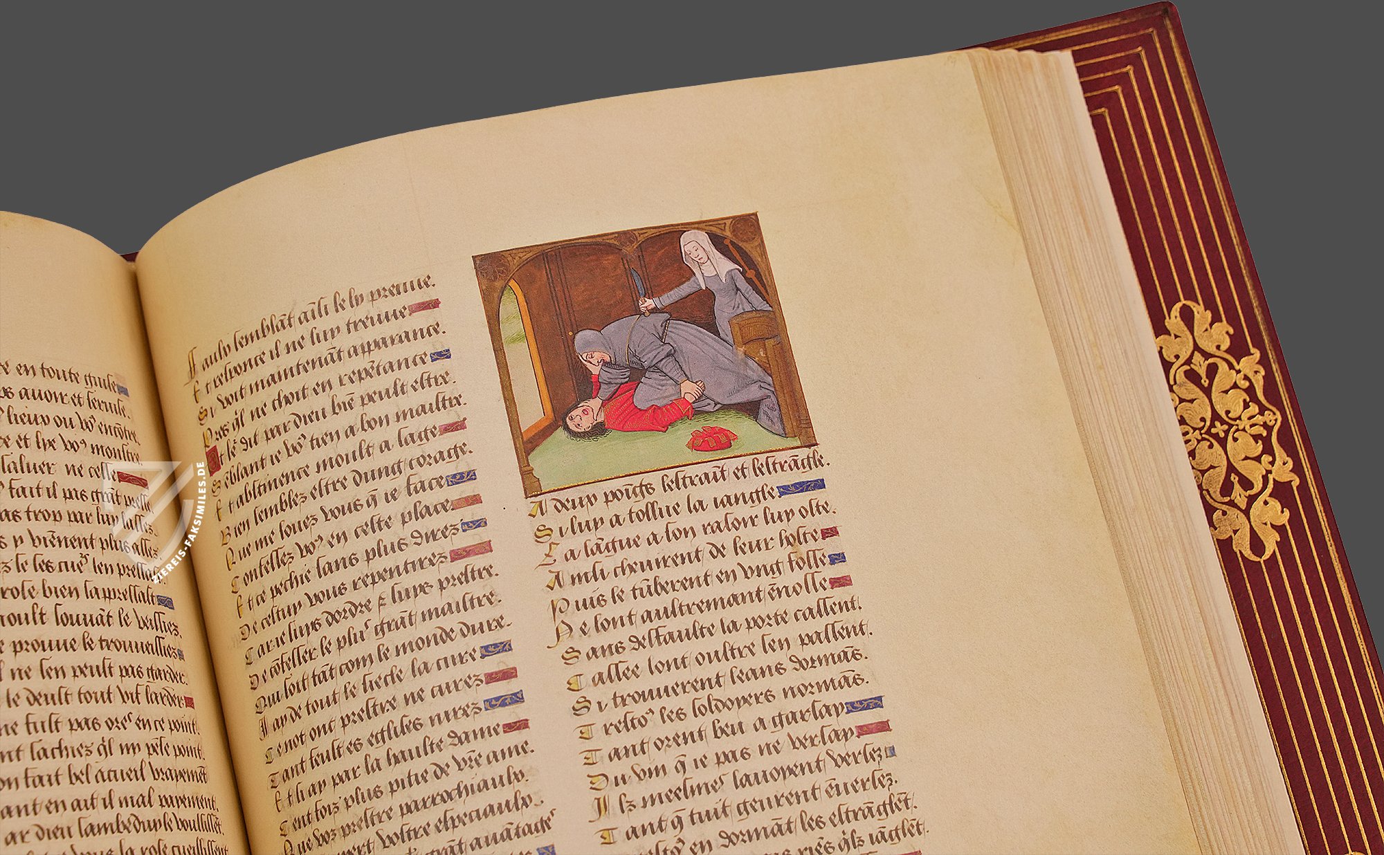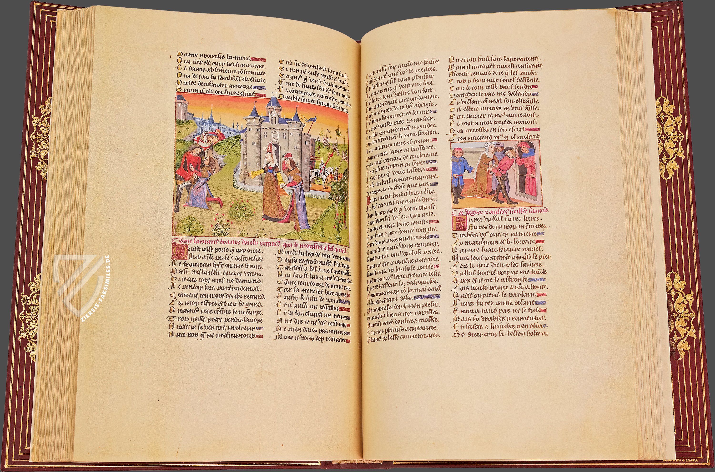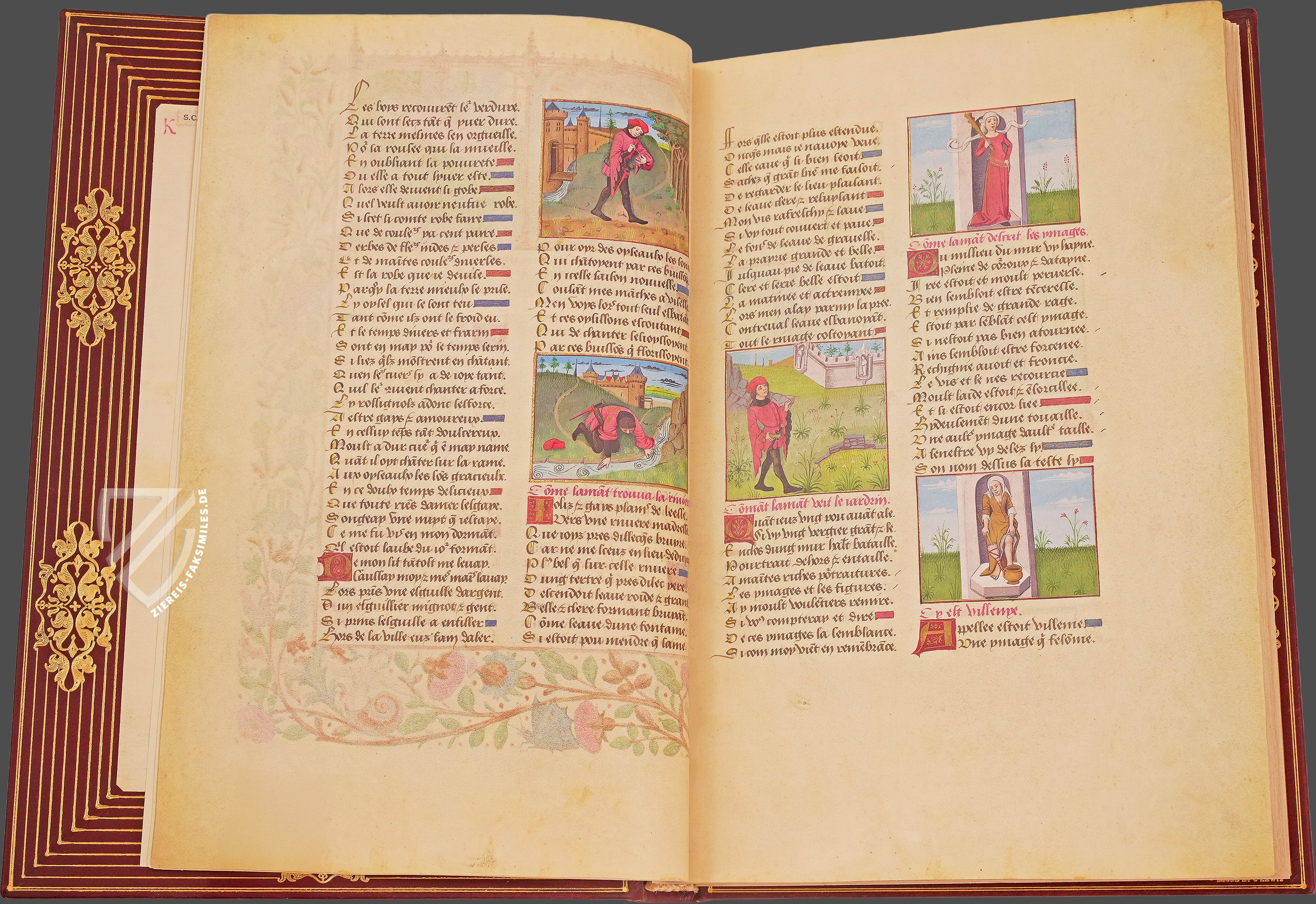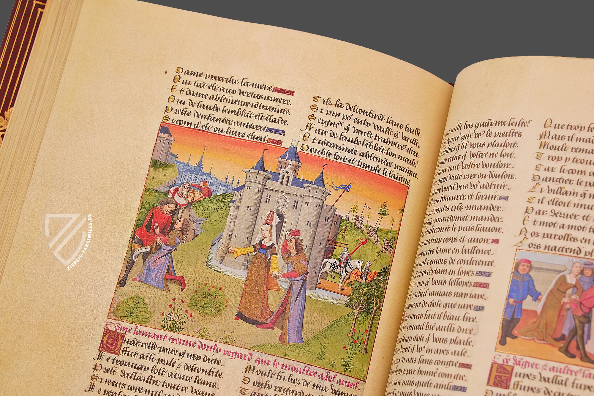 Die wunderschöne Abschrift des Roman de la Rose in der Bodlein Library ist eine der am reichsten illuminierten Handschriften des mittelalterlichen Beststellers. Sie wurde von Luise von Savoyen (1476–1531), zur Entstehungszeit noch Gräfin von Angoulême, in Auftrag gegeben und von Robinet Testard (fl. 1475–1531) mit insgesamt 127 ausdrucksstarken, erzählerischen Miniaturen und Dutzenden goldenen Zierinitialen ausgestattet. Der von Guillaume de Lorris um 1235 begonnene und von Jean de Meung um 1280 in Paris vollendete Rosenroman war bis in die Renaissance eines der meistgelesenen Werke in Frankreich. Nicht nur die Verwendung der Ich-Perspektive war bahnbrechend, sondern auch die allegorischen Figuren und die Darstellung der gesamten Erzählung in Form eines Traums. Zugleich war das altfranzösische Werk jedoch bereits im 13. Jahrhundert höchst umstritten: während sich einige an der ungewohnt sinnlichen Sprache und den erotischen Motiven störten, kritisierten andere die sich darin manifestierende Frauenfeindlichkeit – darunter etwa Christine de Pizan (1364–1429).