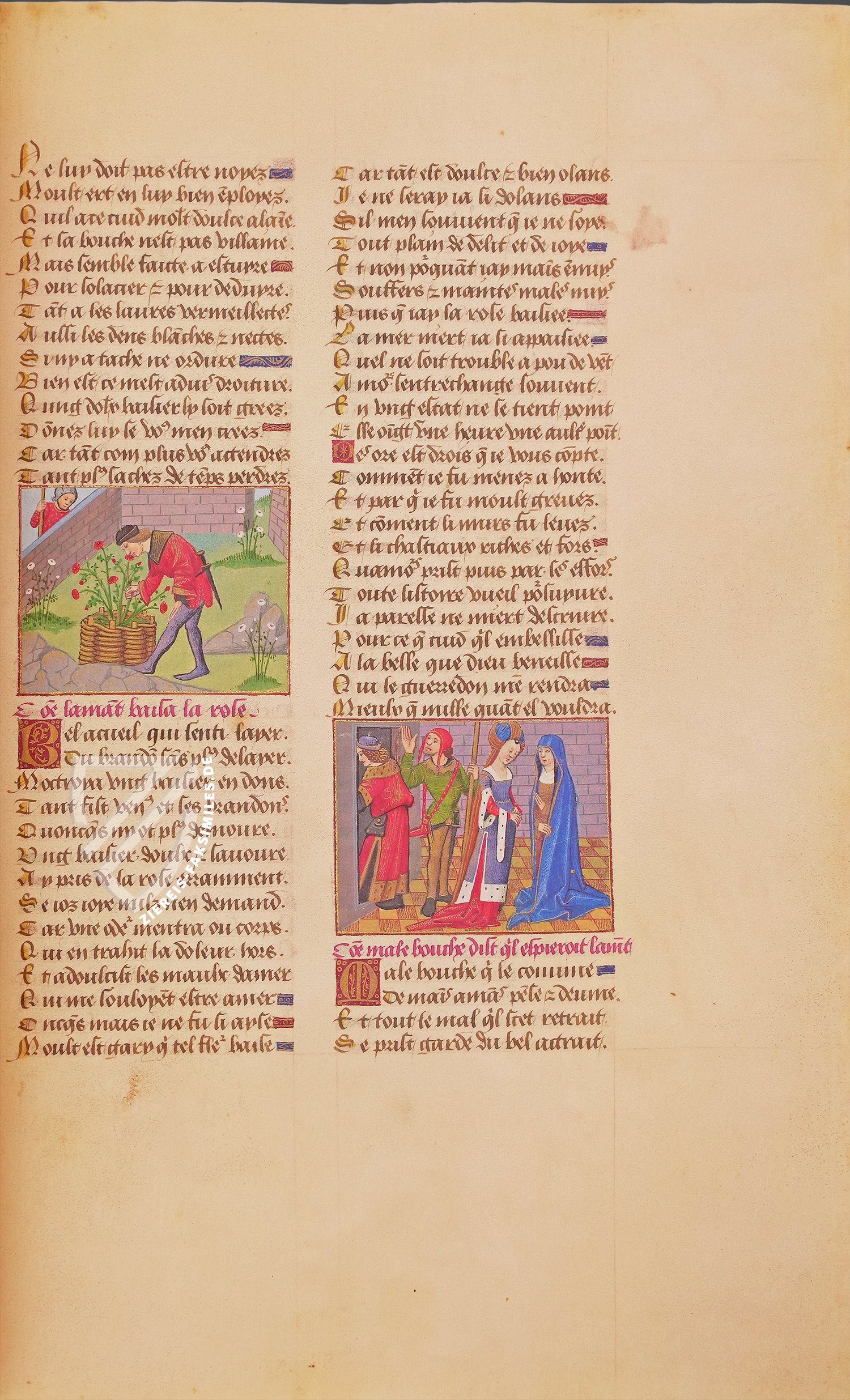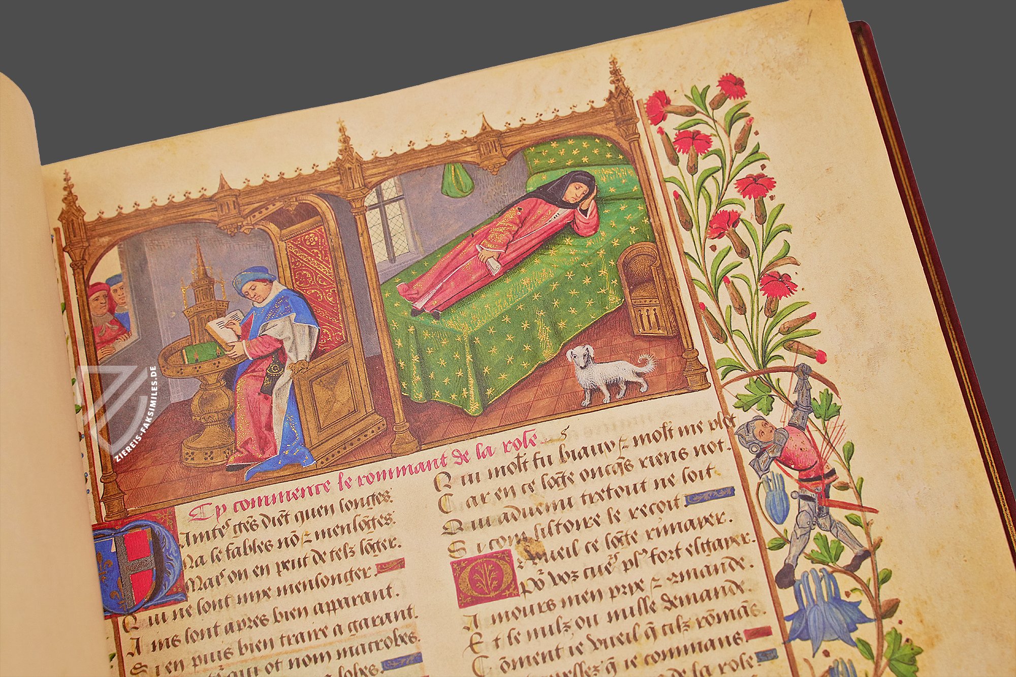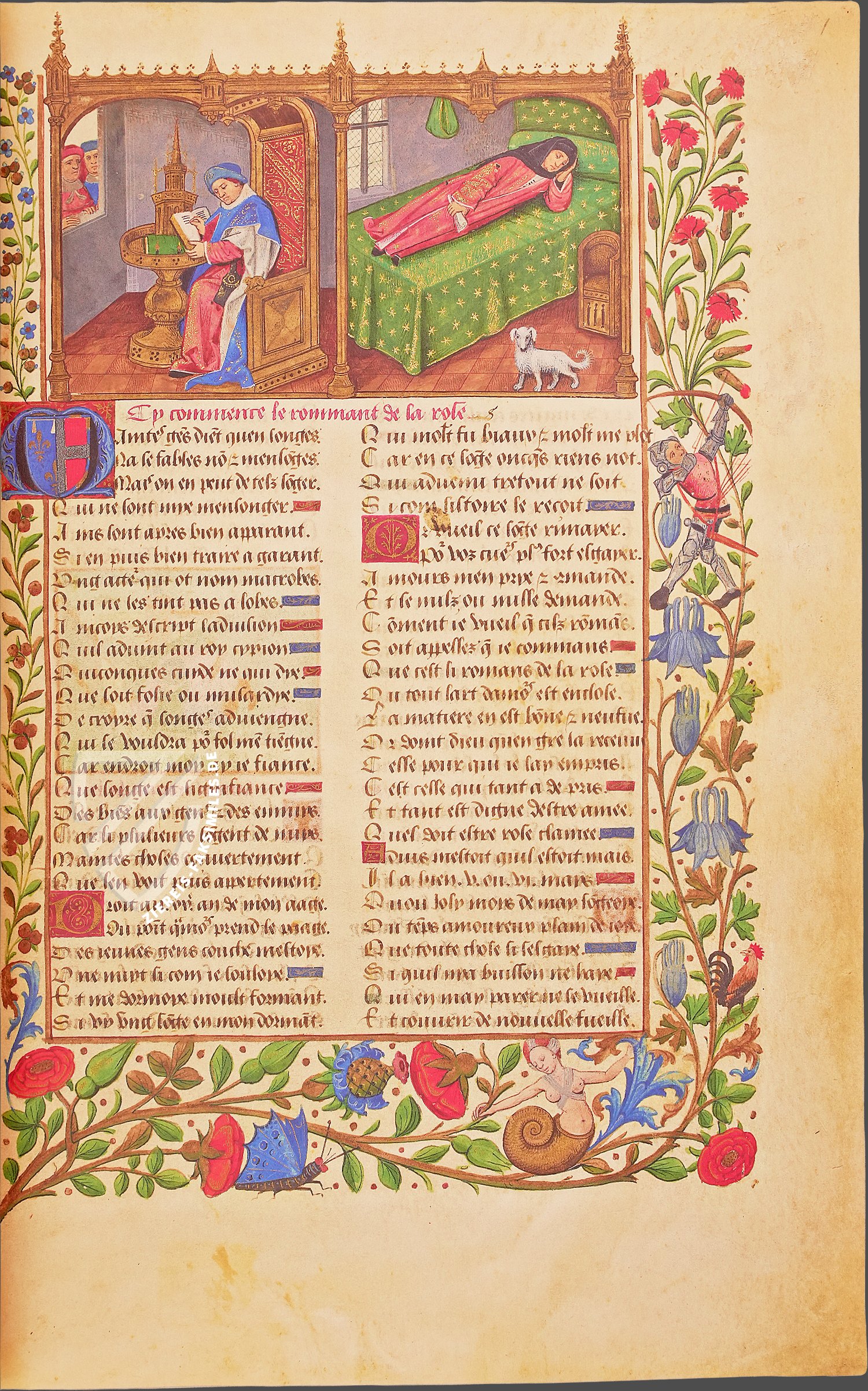 Über dem Text befinden sich zwei kleine Miniaturen in einem zusammenhängenden Rahmen aus zierlichen gotischen Architekturelementen. Das Autorenporträt links präsentiert Guillaume de Lorris bei der Arbeit an seinem Bestseller-Roman – unter Beobachtung zweier neugieriger Passanten. Die rechte Miniatur ist der visuelle Einstieg in die Geschichte: Aman, der Ich-Erzähler und Protagonist, liegt voll bekleidet auf seinem Bett aus kostbaren Textilien und ist mit einer Schriftrolle in der Hand eingeschlafen. Der leere Stuhl lädt die Leserschaft ein, sich dazuzugesellen und seinem Traum zu folgen, wird aber von seinem loyalen Hund bewacht.
