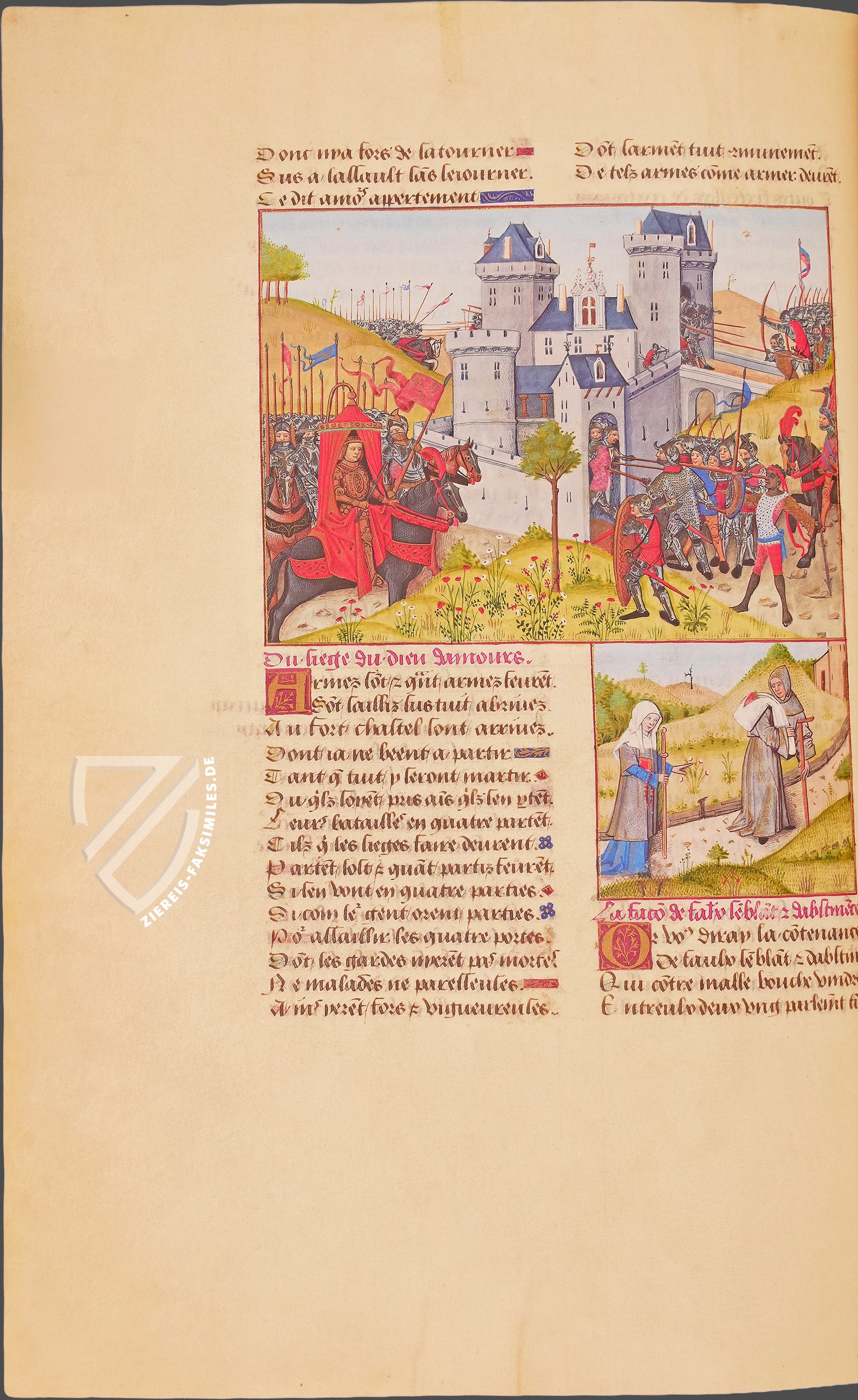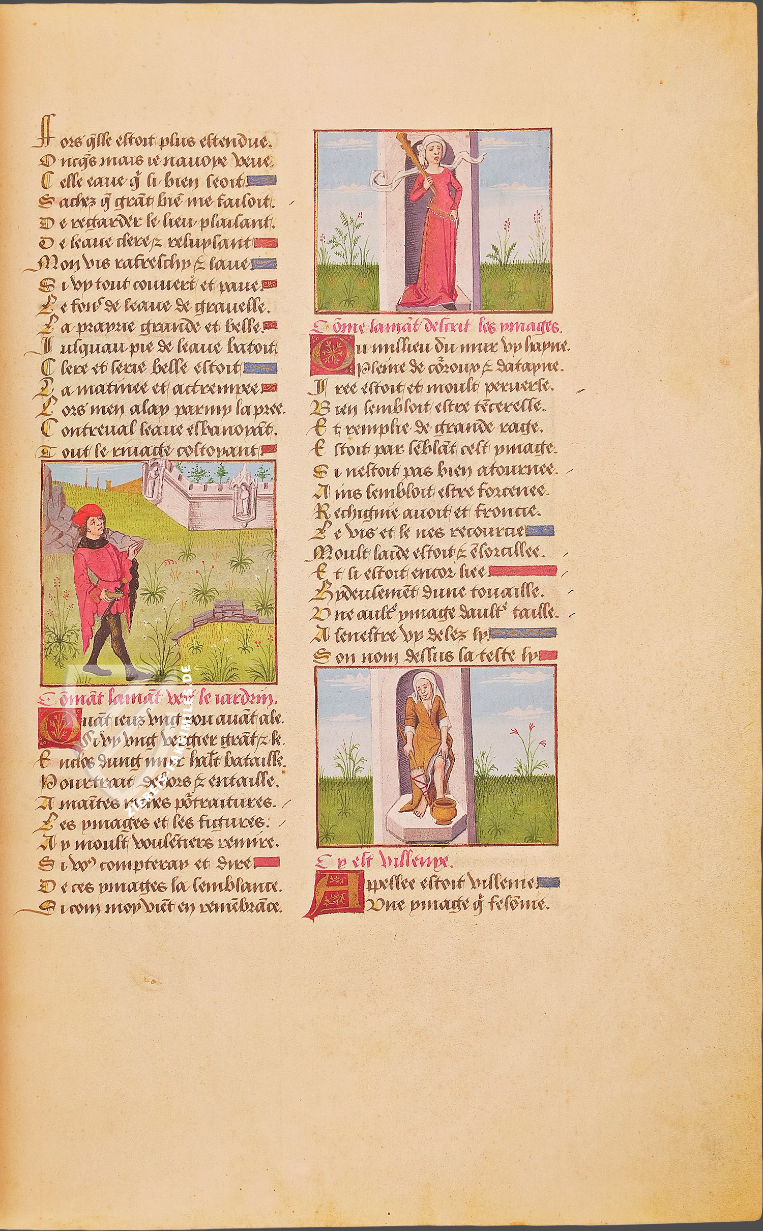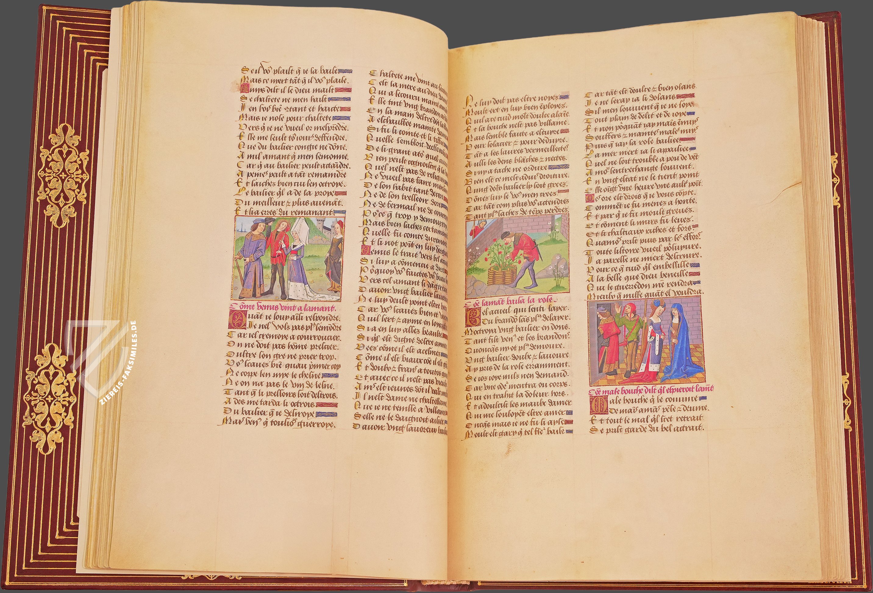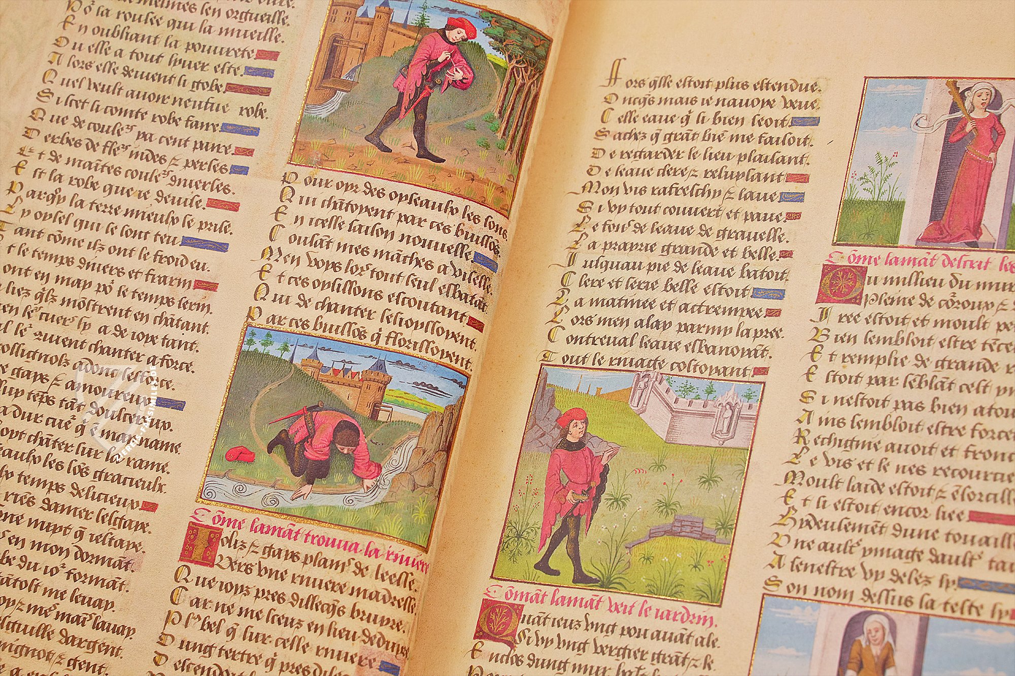 Über dem Text befinden sich zwei kleine Miniaturen in einem zusammenhängenden Rahmen aus zierlichen gotischen Architekturelementen. Das Autorenporträt links präsentiert Guillaume de Lorris bei der Arbeit an seinem Bestseller-Roman – unter Beobachtung zweier neugieriger Passanten. Die rechte Miniatur ist der visuelle Einstieg in die Geschichte: Aman, der Ich-Erzähler und Protagonist, liegt voll bekleidet auf seinem Bett aus kostbaren Textilien und ist mit einer Schriftrolle in der Hand eingeschlafen. Der leere Stuhl lädt die Leserschaft ein, sich dazuzugesellen und seinem Traum zu folgen, wird aber von seinem loyalen Hund bewacht.